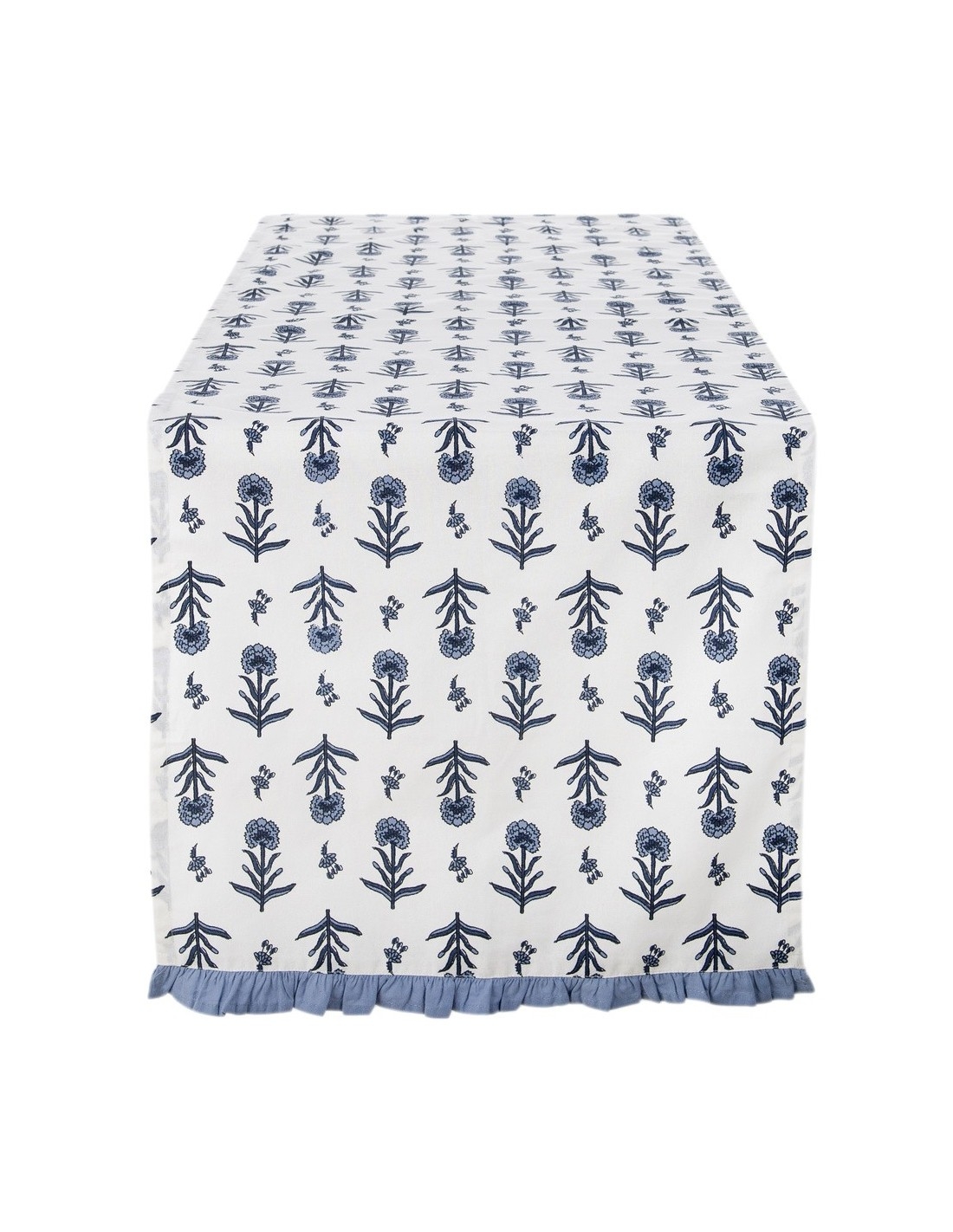 Bavlnený obrus - behúň v bielej farbe s dekorom modrých kvietkov a volánikovým lemom v schaby chic romantickom štýle 45 x 150 cm Blanc Maricló 41805