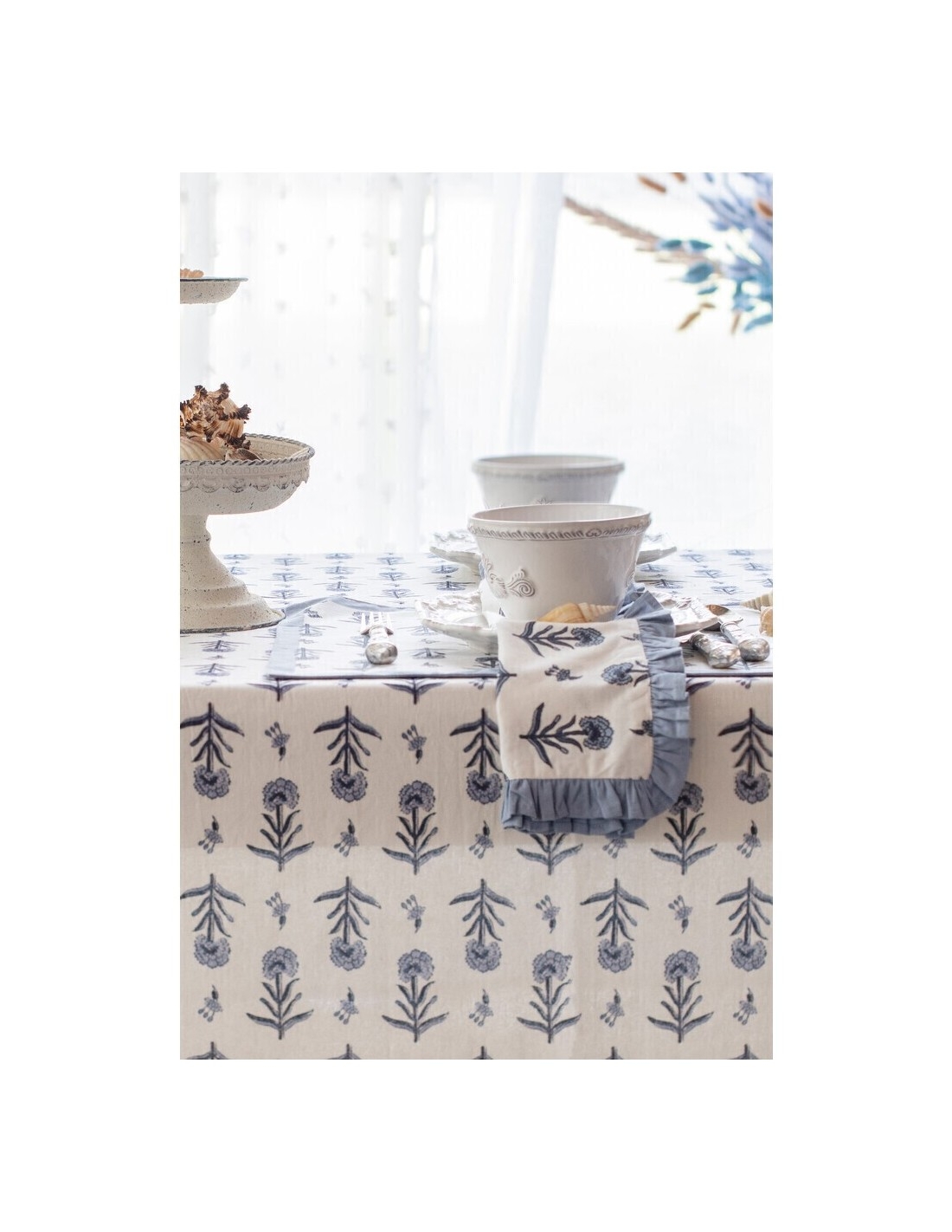 Bavlnený obrus - behúň v bielej farbe s dekorom modrých kvietkov a volánikovým lemom od exkluzívnej talianskej značky Blanc Maricló . Obrus je vyrobený v schaby chic a romantickom štýle , ktorý si zamiluje nejeden milovník vintage doplnkov. Obrus je skvelým doplnkom do každej domácnosti alebo vidieckeho sídla .Obrus je krásnym doplnkom na Váš každodenný stôl.