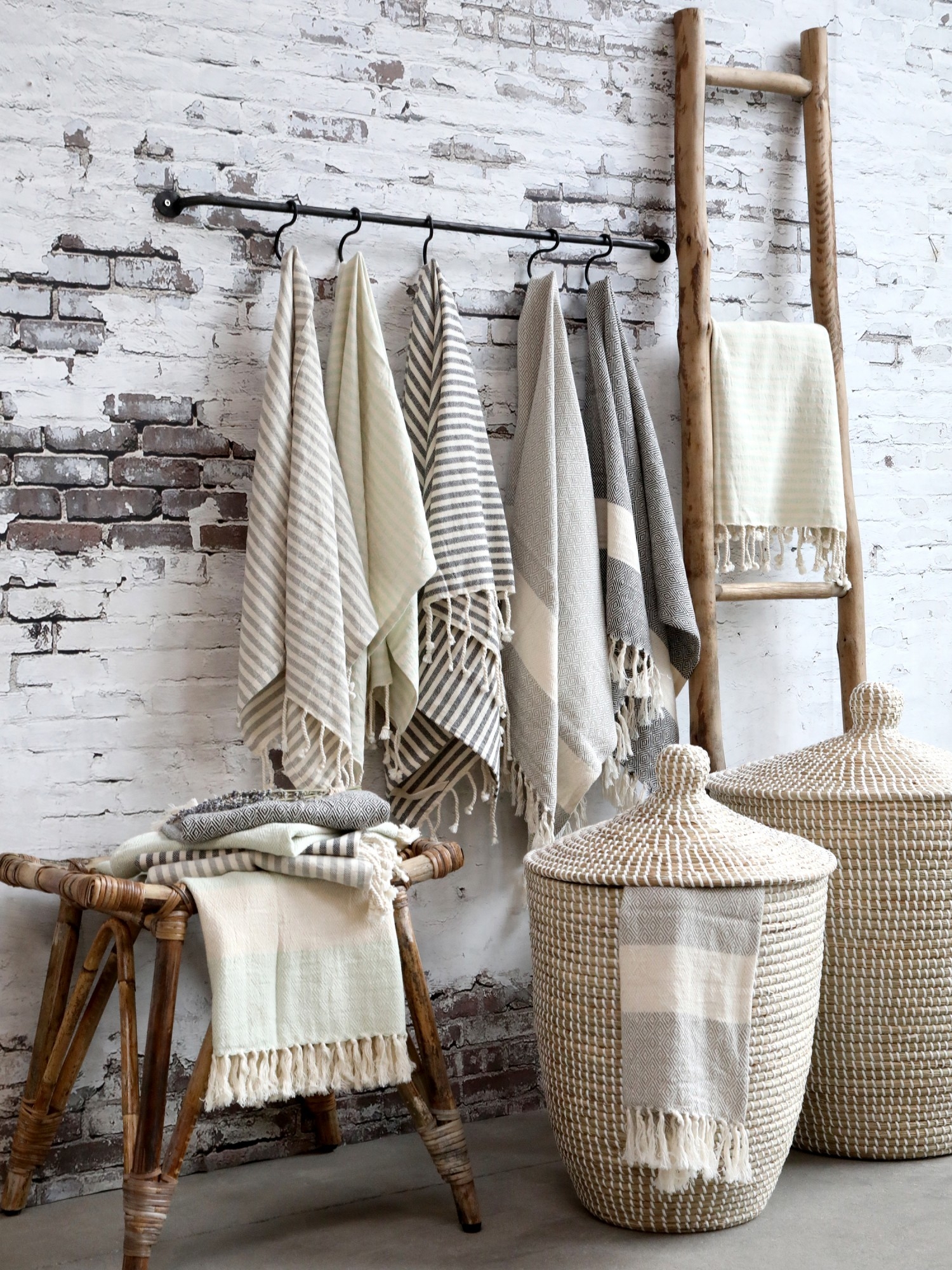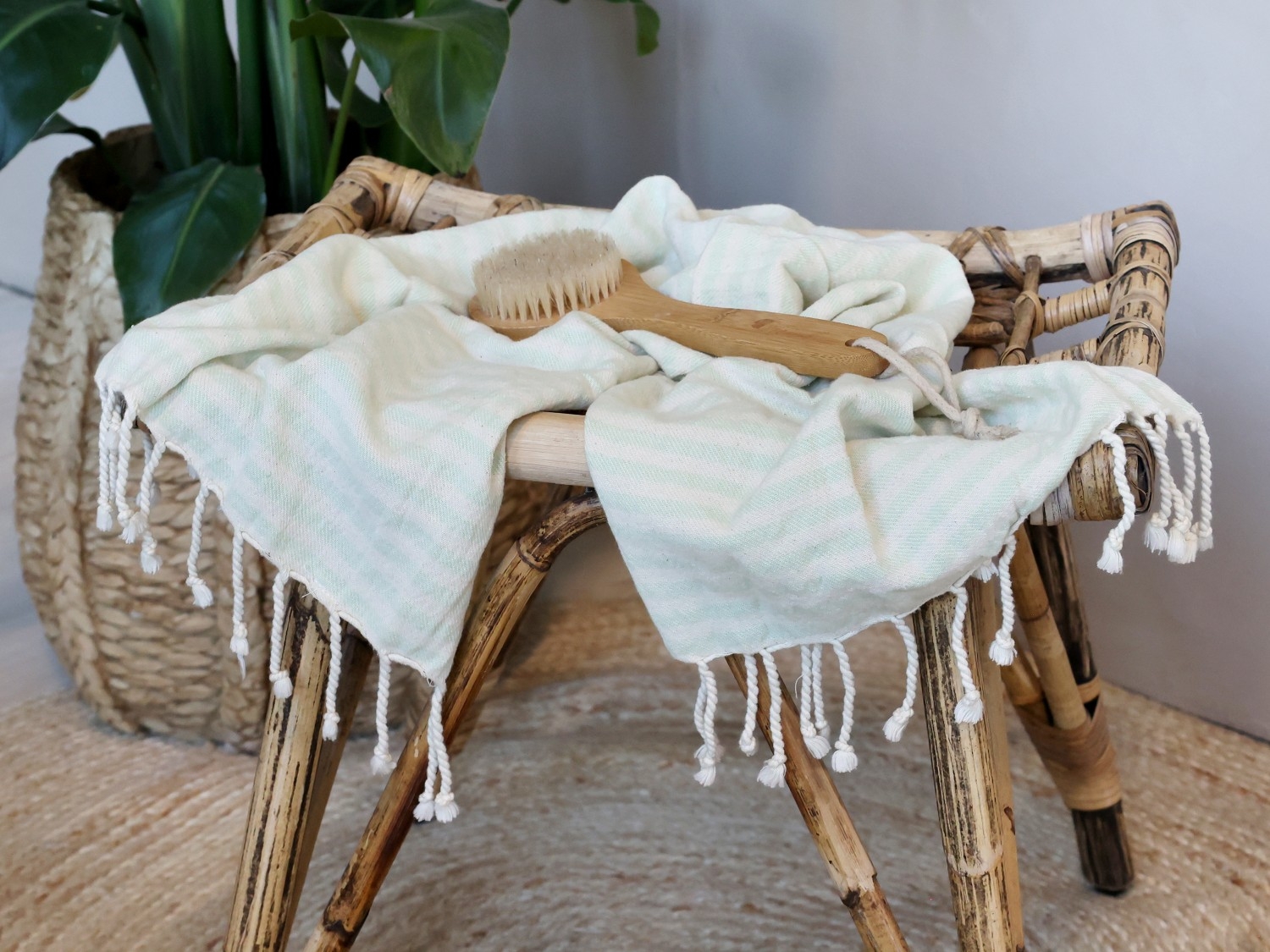 Bavlnený uterák Hammam v prúžkovanom zeleno-bielom prevedení so strapcami z dielne dánskej značky Chic Antique . Uterák je vyrobený vo vintage štýle, ktorý si zamiluje nejeden milovník vintage doplnkov. Nádherný doplnok do Vašej kúpeľne, vynímať sa bude všade. Uterák obsahuje 100 % bavlny. Rozmer uteráku je 90 x 45 cm.