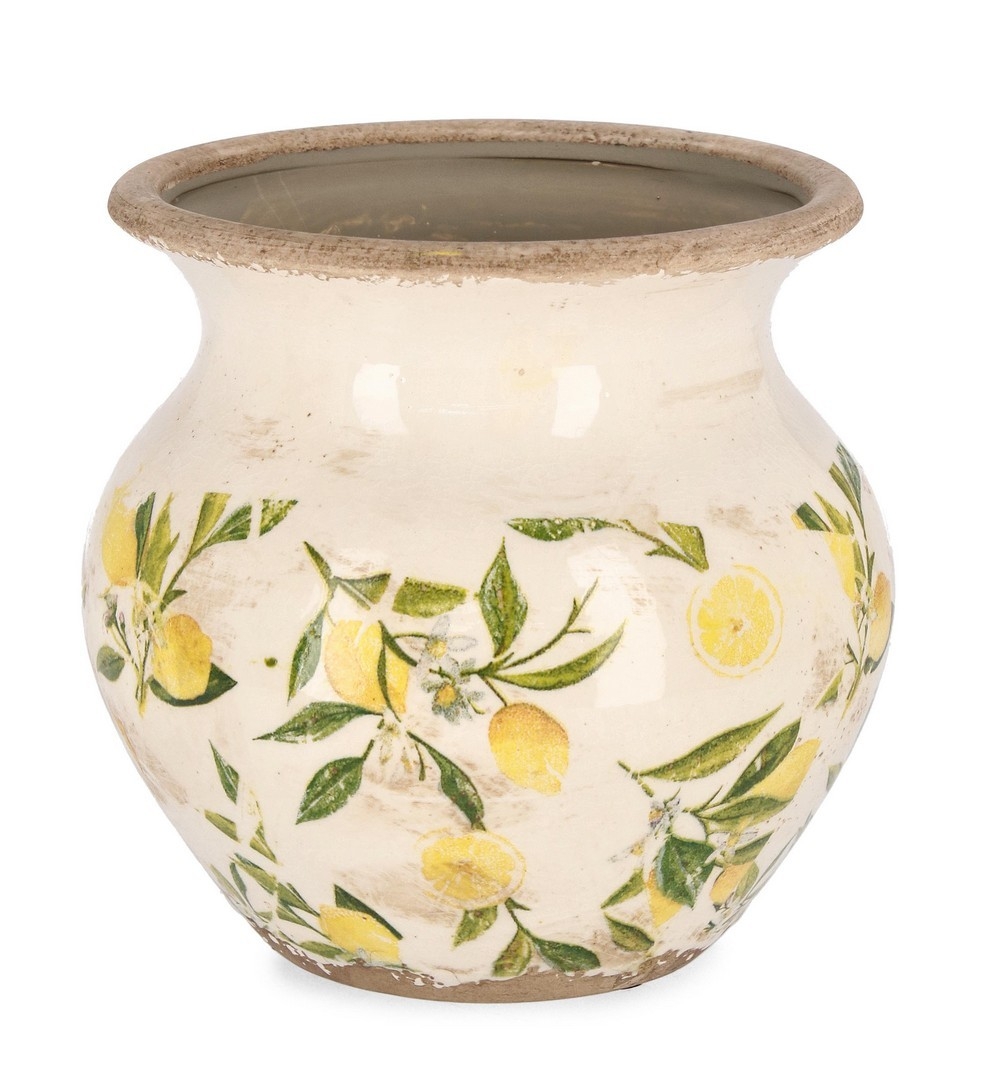 Keramický béžový kvetináč s obitým vzhľadom s dekorom citrónov vo vintage štýle z dielne talianskej značky Bizzotto. Kvetináč je vhodný do interiéru. Krásne v ňom vyniknú Vaše kvietky alebo rastlinky. Vďaka glazovanému ošúchanému vzhľadu je nádherným doplnkom do Vašej domácnosti. Rozmer kvetináča je 19 x 18,5 cm.