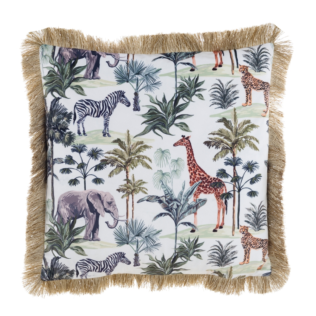 Vankúš polyester s dekorom safari zvierat a strapcami po krajoch vankúša od exkluzívnej talianskej značky Blanc Maricló. Vankúš je vyrobený v schaby chic a romantickom štýle, ktorý si zamiluje nejeden milovník vintage prvkov. Pekný a jednoduchý vzor na vankúši dodáva eleganciu a jemnosť. Vankúš je pekná ozdoba do bytu alebo domu, ako dekorácia na gauč, kreslo alebo posteľ.