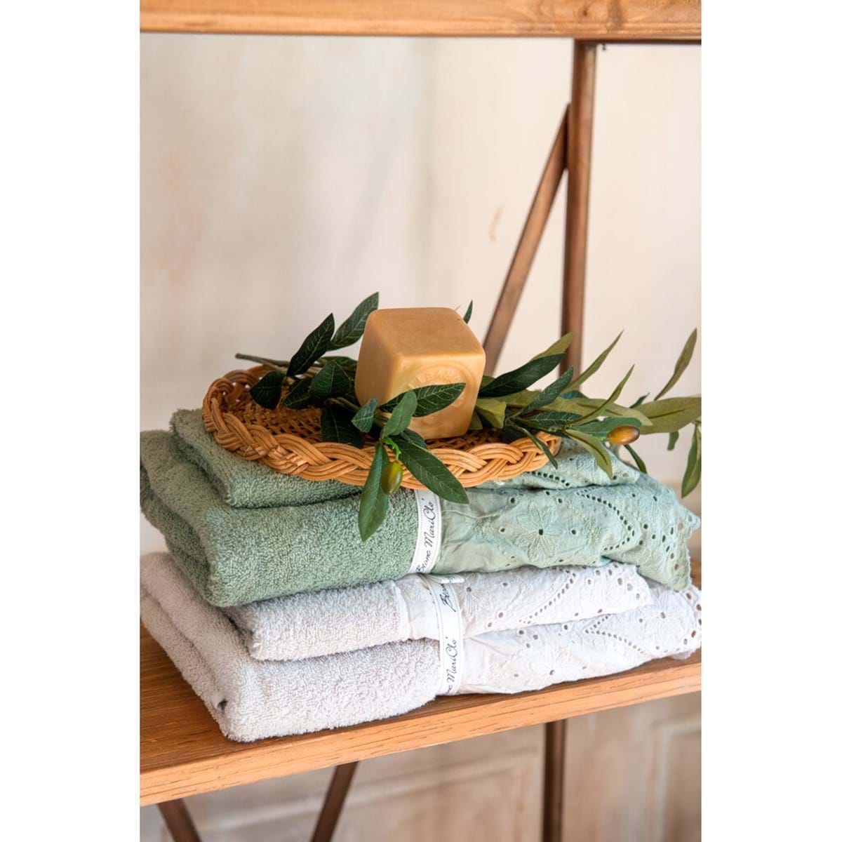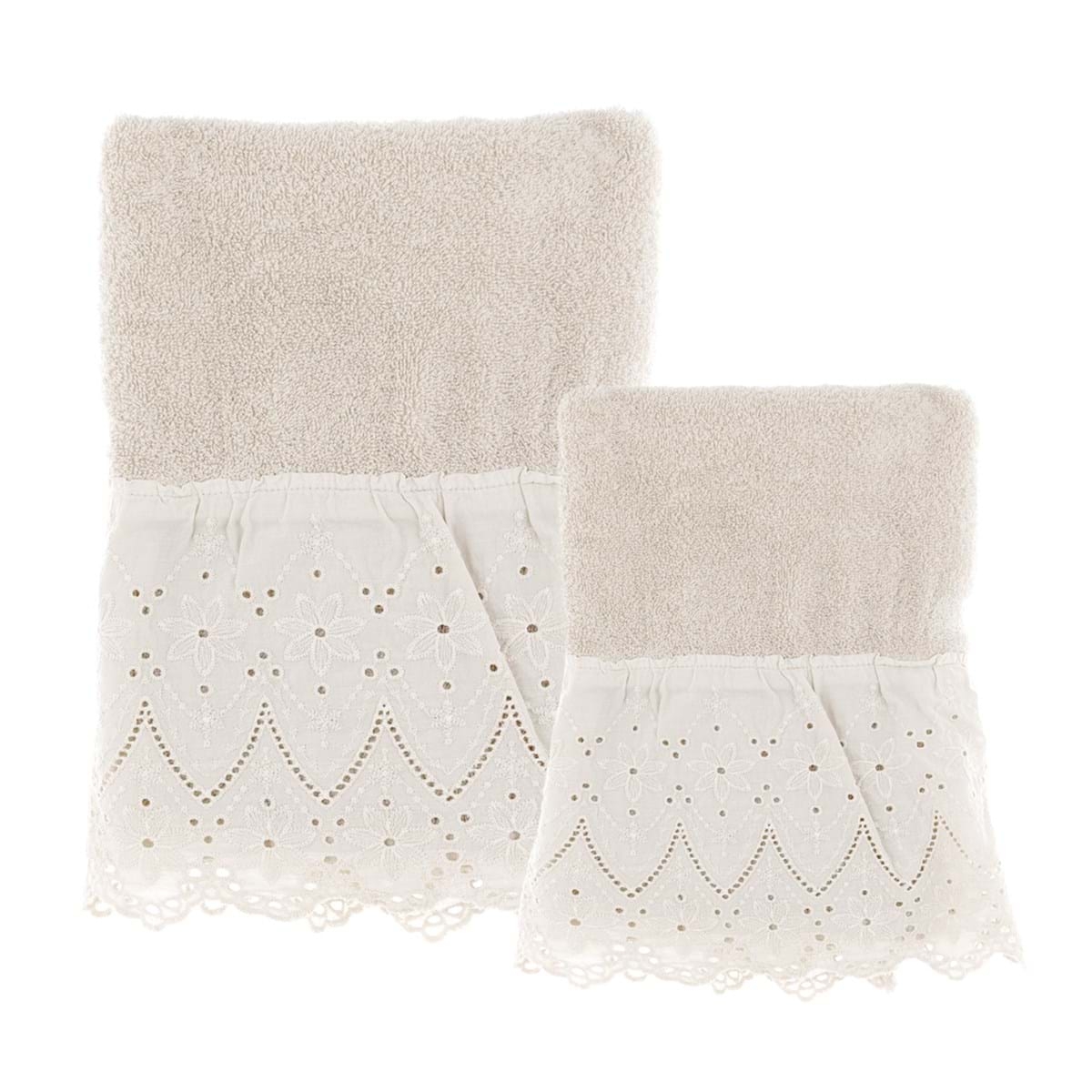 Bavlnený set dvoch uterákov v krémovom farebnom prevedení s volánikom od exkluzívnej talianskej značky Blanc Maricló. Uterák je vyrobený v schaby chic a romantickom štýle, ktorý si zamiluje nejeden milovník vintage prvkov. Nádherný doplnok do Vašej kúpeľne, vynímať sa bude všade. Uteráky obsahujú 100 % bavlny.