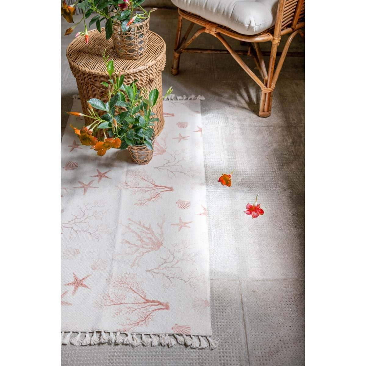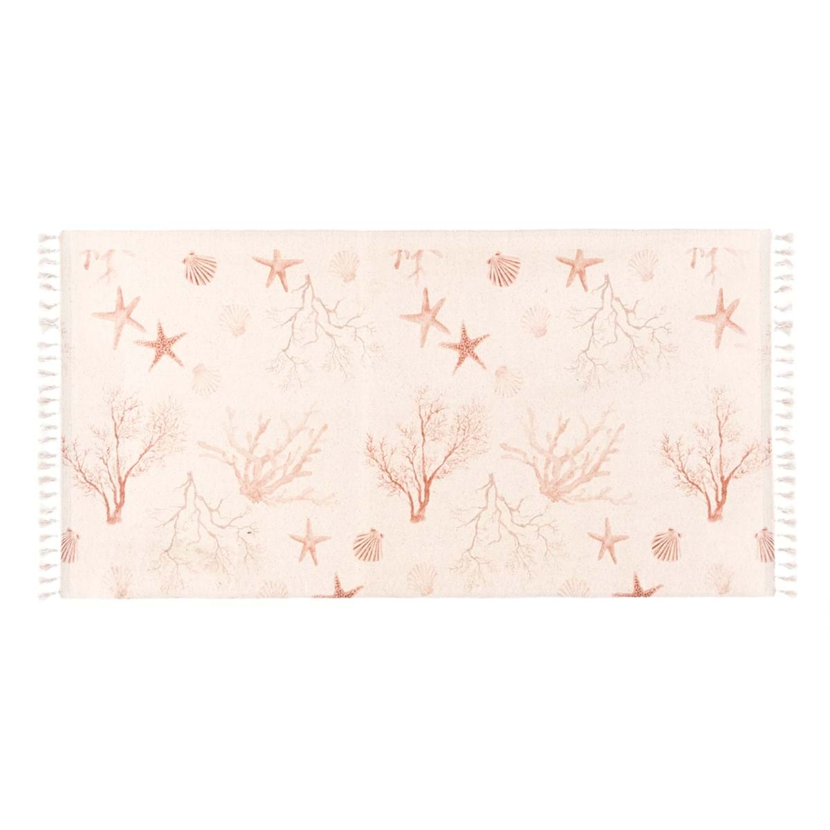 Bavlnený koberec s morským motívom a strapcami od exkluzívnej talianskej značky Blanc Maricló. Koberec je vyrobený v schaby chic a romantickom štýle, ktorý si zamiluje nejeden milovník vintage prvkov. Vhodný je do obývačky, do spálne alebo detskej izby. Hustá a pevná tkanina zabráni chladnému dotyku o Vašu podlahu.