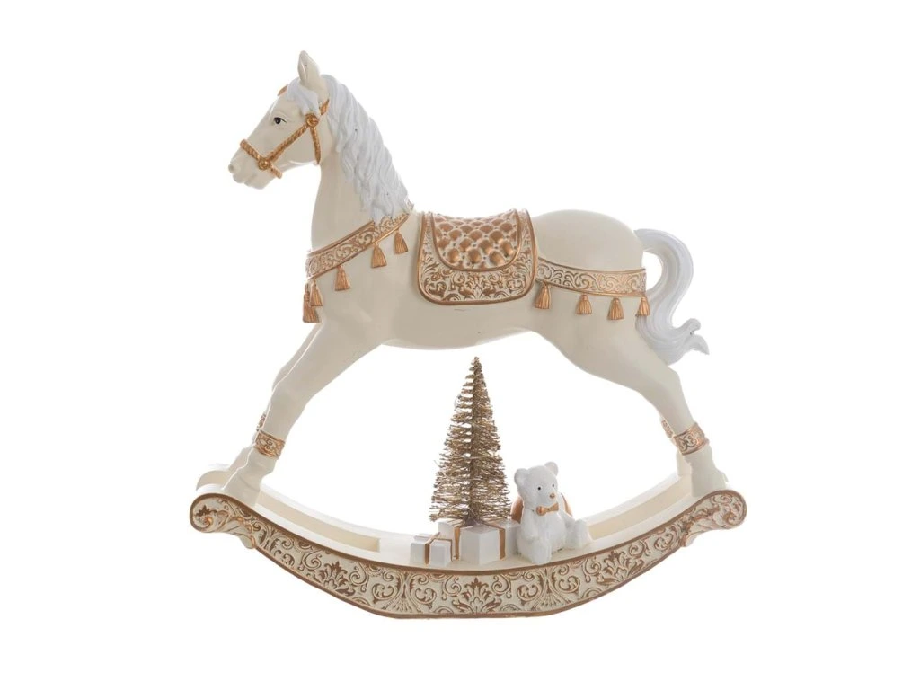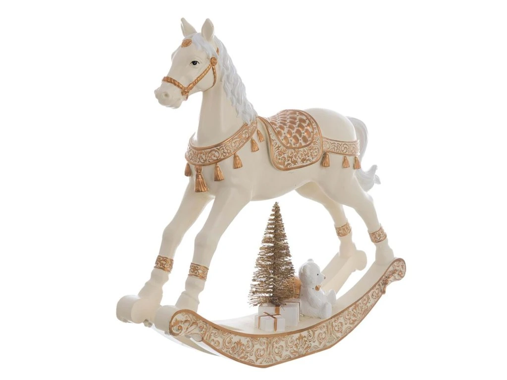 Rozprávková vianočná dekorácia hojdacieho koníka od talianskej značky :contentReference[oaicite:0]{index=0} z kolekcie Dora je vyrobená z kvalitného polyresinu. V elegantnej bielej farbe so zlatými detailmi pôsobí nostalgicky a jemne – ako spomienka na tradičné Vianoce.