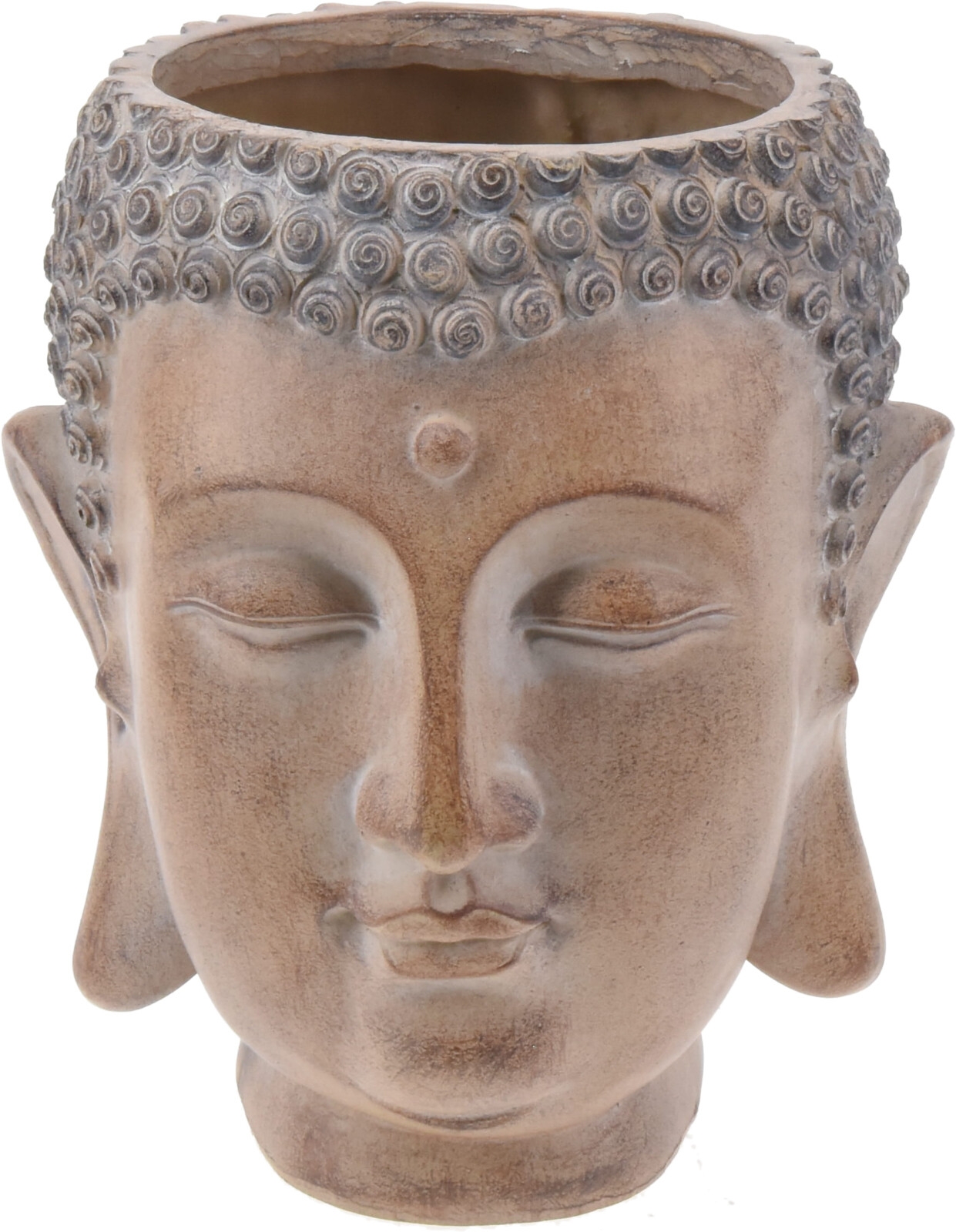 Cementová záhradná dekorácia sochy hlavy buddhu v hnedo-sivom farebnom prevedení s otvorom ako kvetináčom 17 x 20 cm 43173