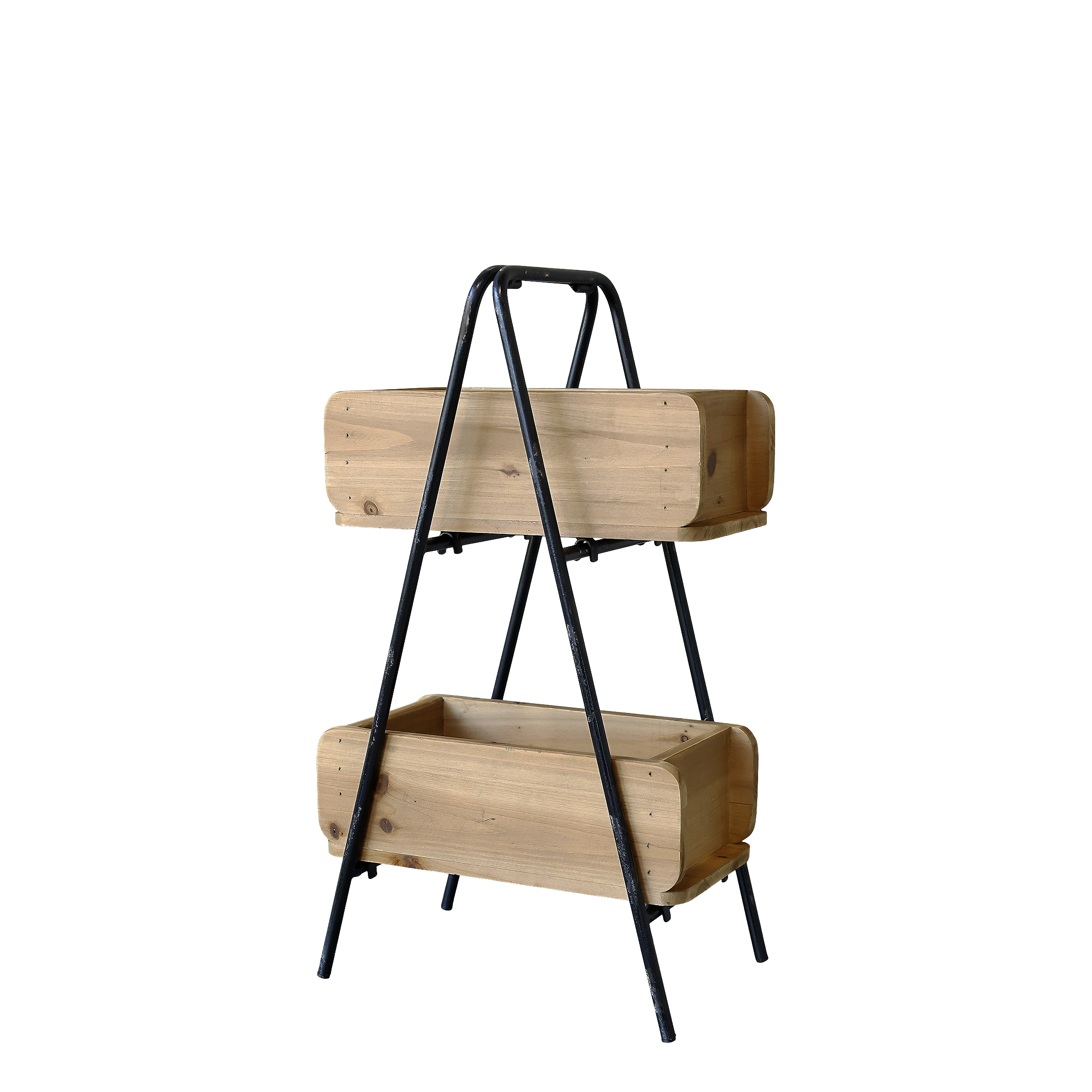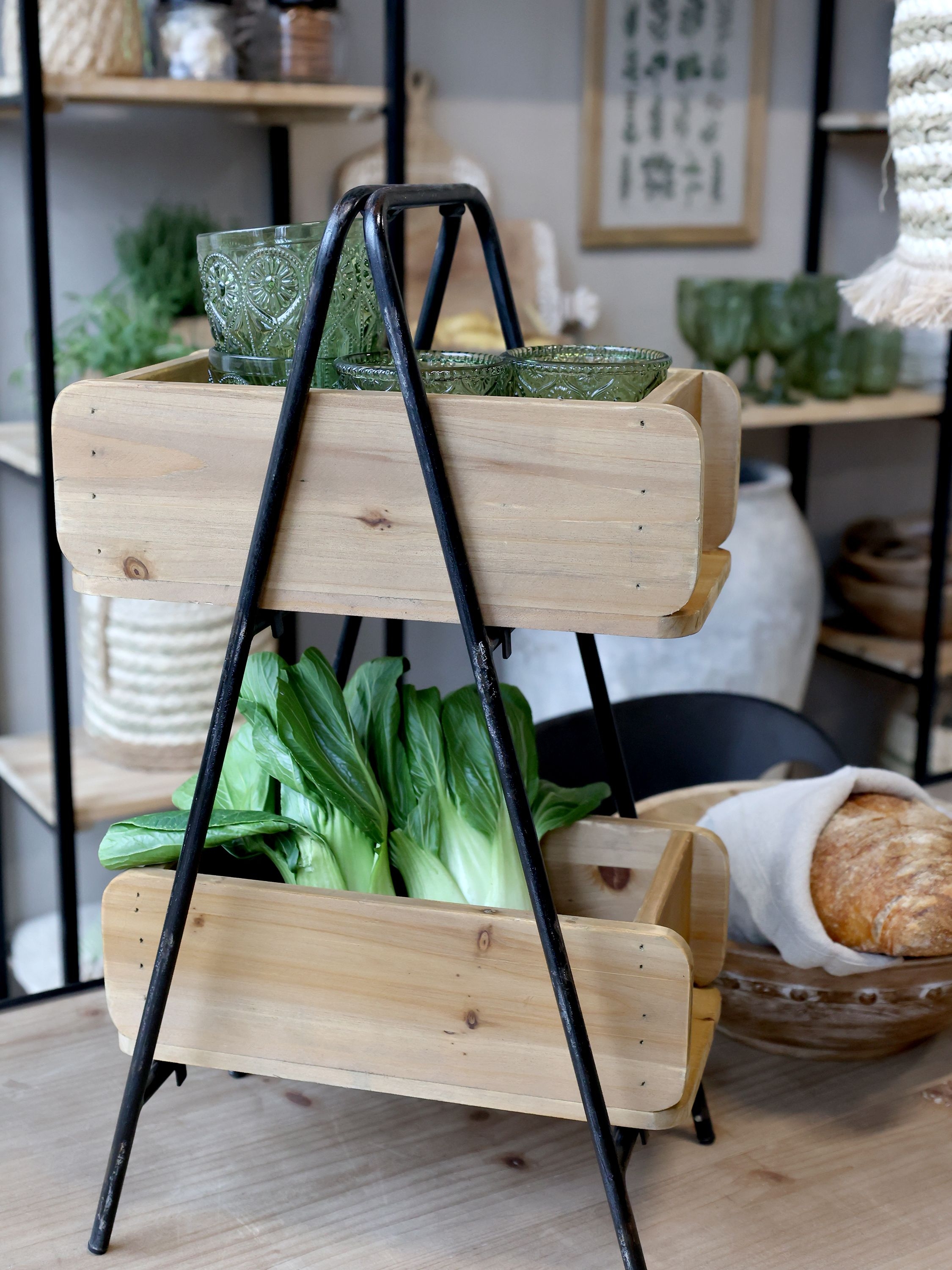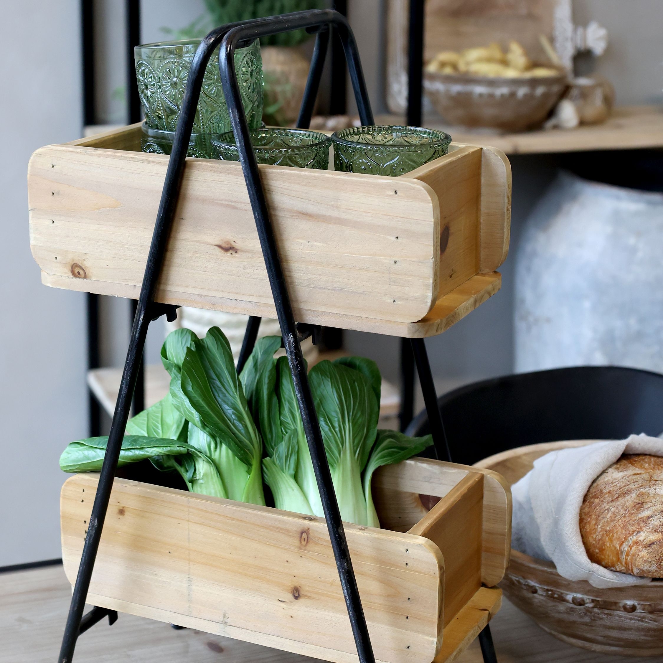 Kovový stojan v čiernom farebnom prevedení s dvomi debničkami v hnedom prevedení z dielne dánskej značky Chic Antique. Použitie v kuchyni v kúpeľni, či v ktorejkoľvek miestnosti na uloženie rôznych drobností v kúpeľni, ovocia a zeleniny v kuchyni a podobne. Rozmer stojanu je 30 x 20 x 53,5 cm.