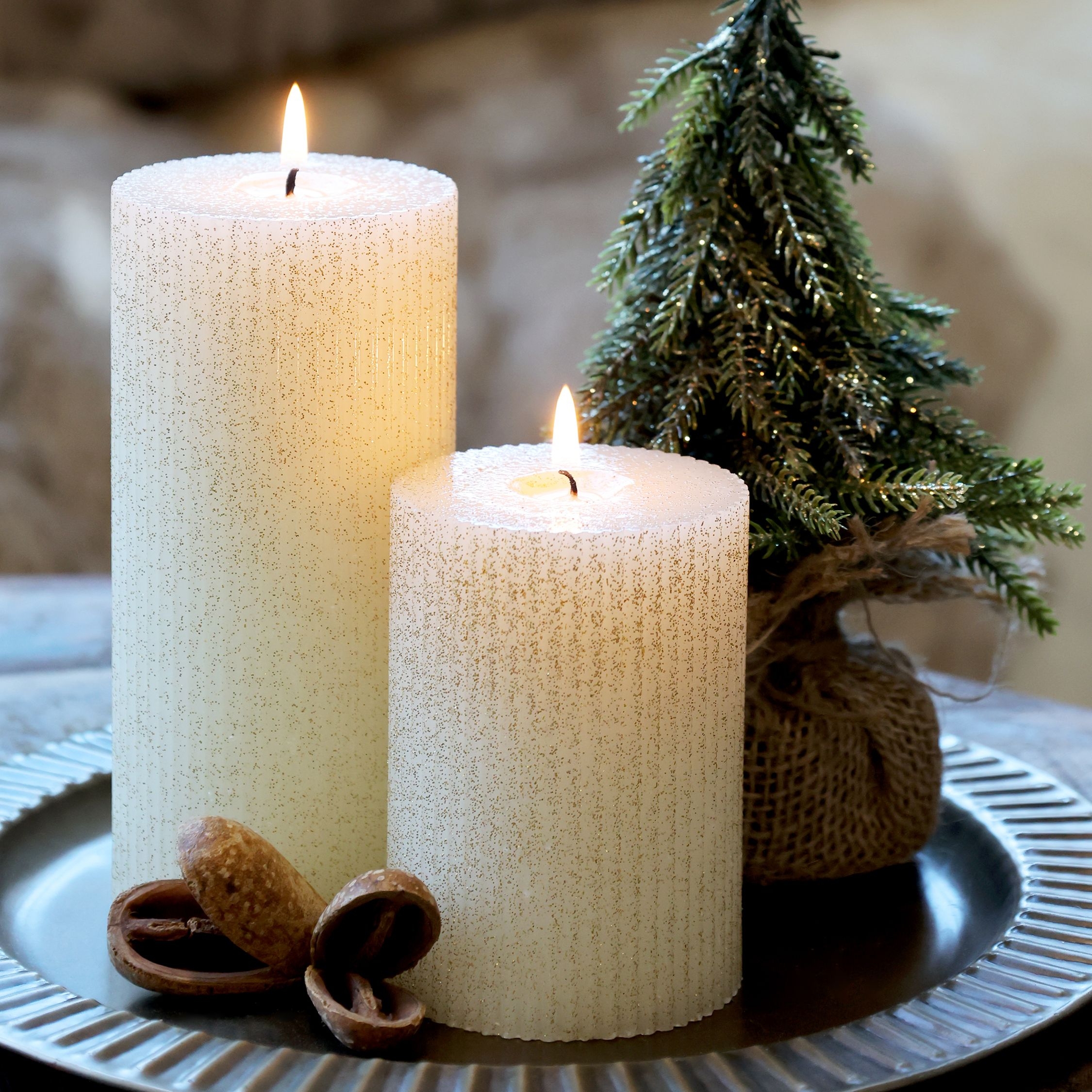 Rustikálna stĺpová sviečka v krémovej farbe s trblietkami z dielne dánskej značky Chic Antique. Materiál: sviečka 100% parafín, knôt 100% bavlna. Dekorácia je ideálnym doplnkom do Vášho domova. Sviečky sú neustále testované, aby sa zaistilo, že vyžarujú absolútne minimum sadzí. Dĺžka horenia 64 hodín. Rozmer sviečky je Ø 7 x 15 cm.