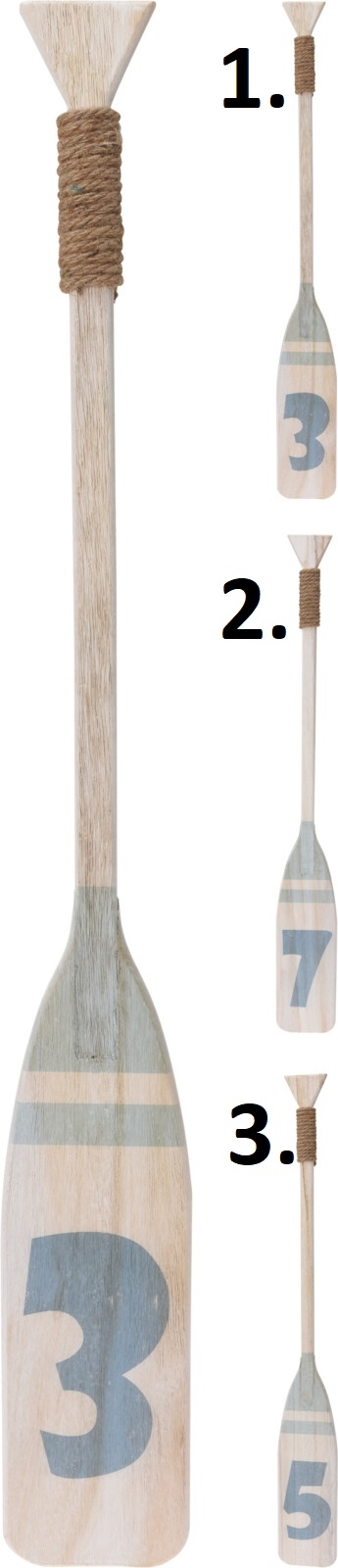 Drevená dekorácia modro-bieleho prírodného vesla s nápismi čísel a jutovými šnúrkami v troch prevedeniach je jedinečným a originálnym doplnkom do každej domácnosti aj pre milovníka morského štýlu. Veslo je kombinovateľné ku iným morským dekoráciám v našej ponuke. Rozmer vesla je 100 cm.