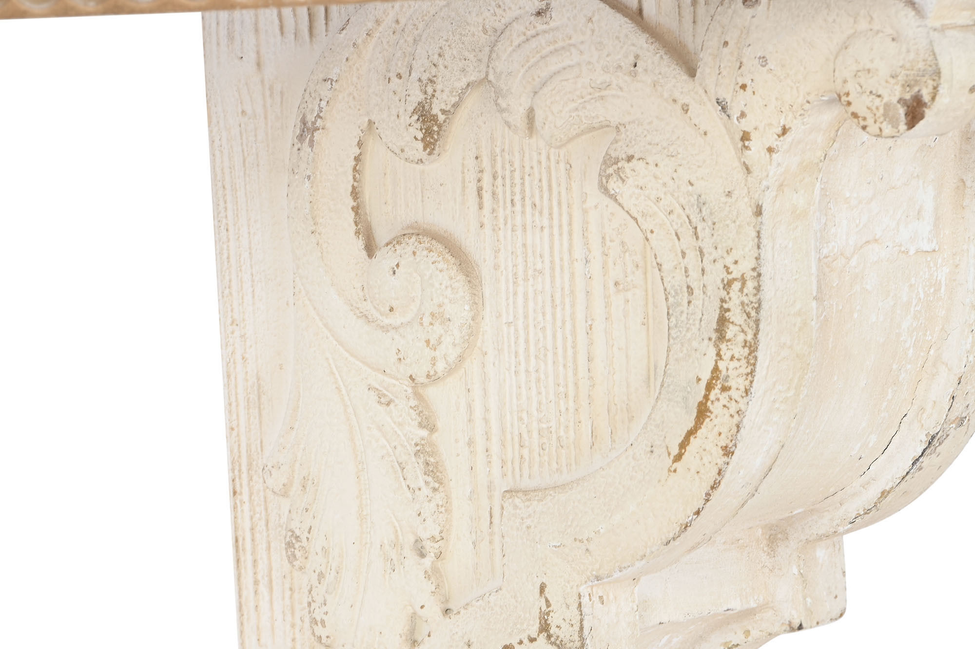 Drevená dekorácia poličky na stenu v bielo-hnedom farebnom prevedení s dekorovaním je krásnym doplnkom do každej domácnosti. Využitie má aj v interiéri aj v exteriéri. Je jedinečným a originálnym doplnkom vďaka bielej patine a vintage dekoru. Hodí sa do každej vintage zariadenej domácnosti. Je vhodným odkladacím priestorom na drobnosti ako sú kľúče alebo osobné doklady alebo krásnou poličkou na vystavenie iných dekorácií. Rozmer poličky je 85 x 35 x 48,5 cm.