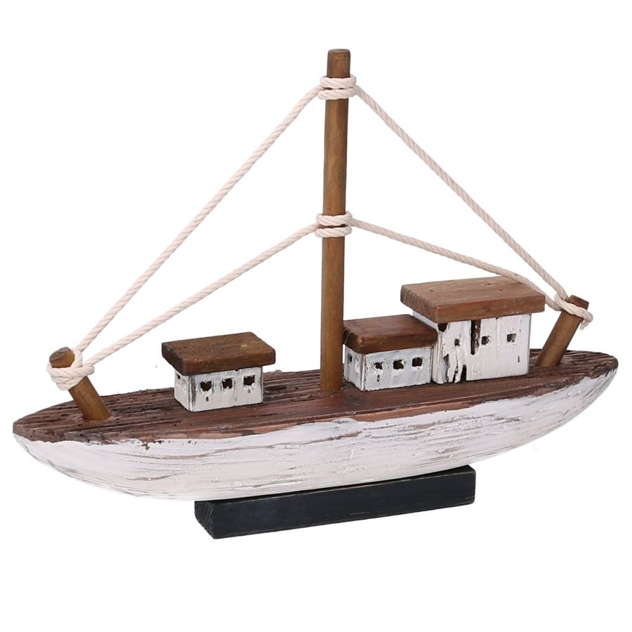 Drevená dekorácie lode v hnedom farebnom prevedení s bielym dekorovaním na postavci 35 x 8,5 x 25cm 31588