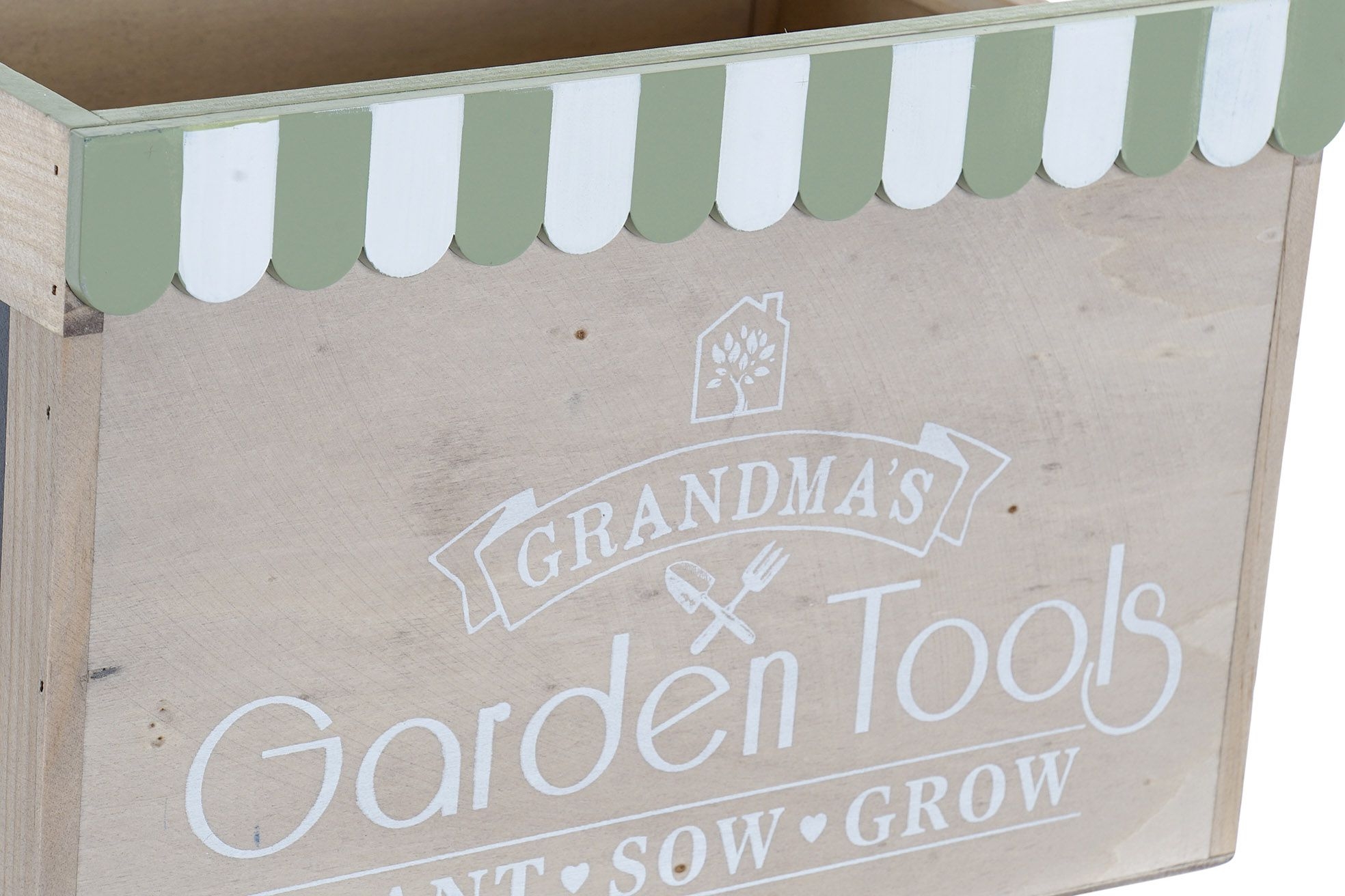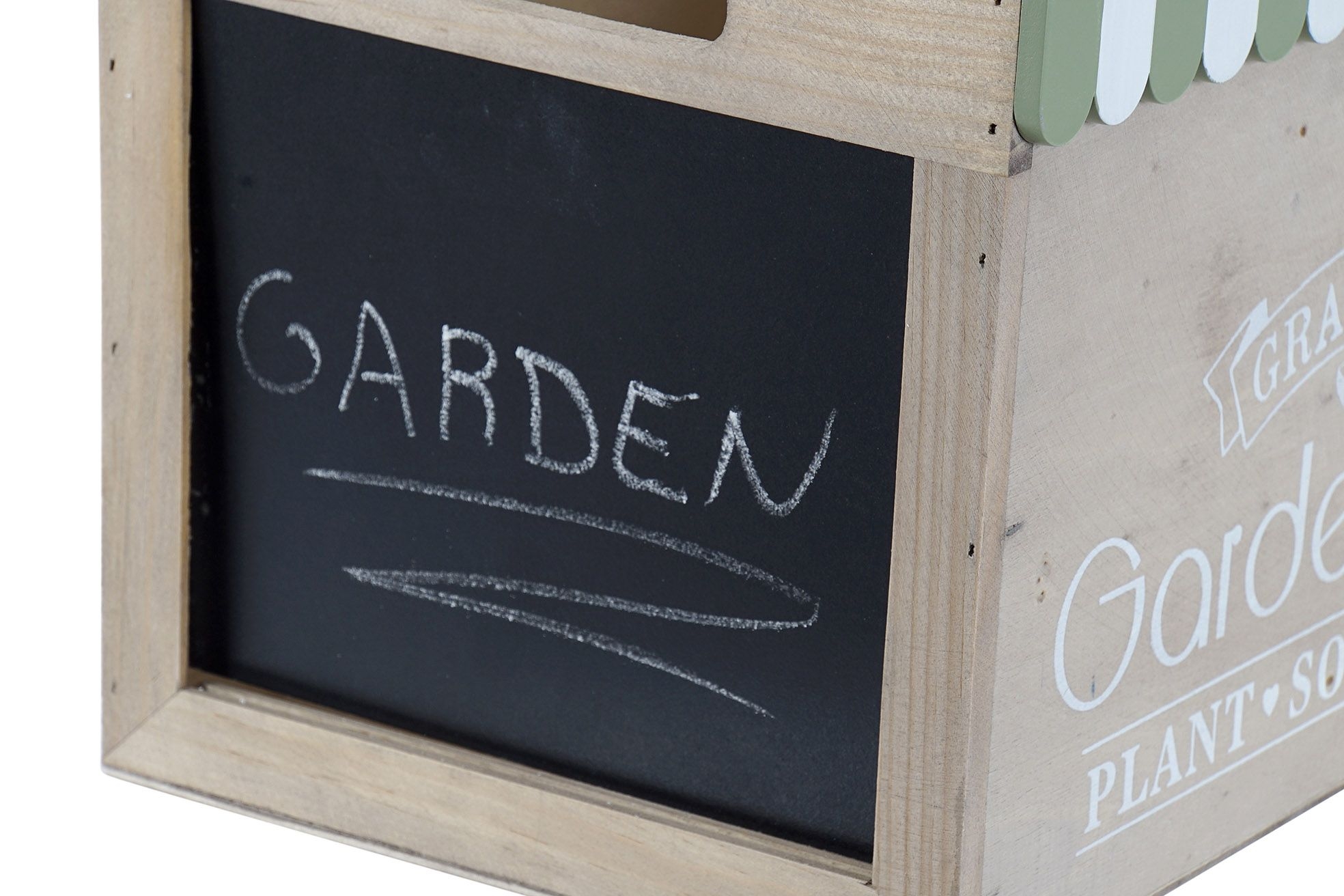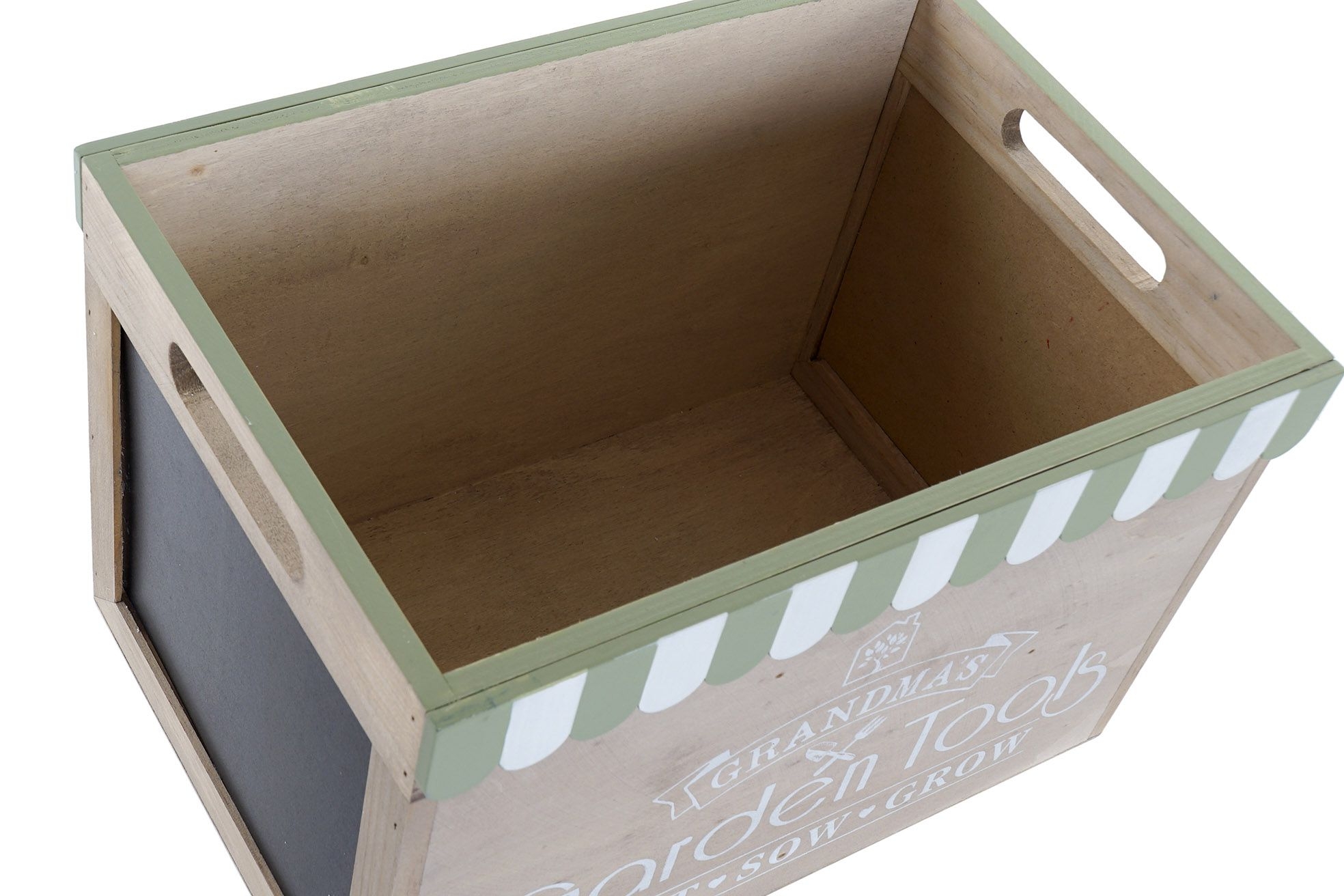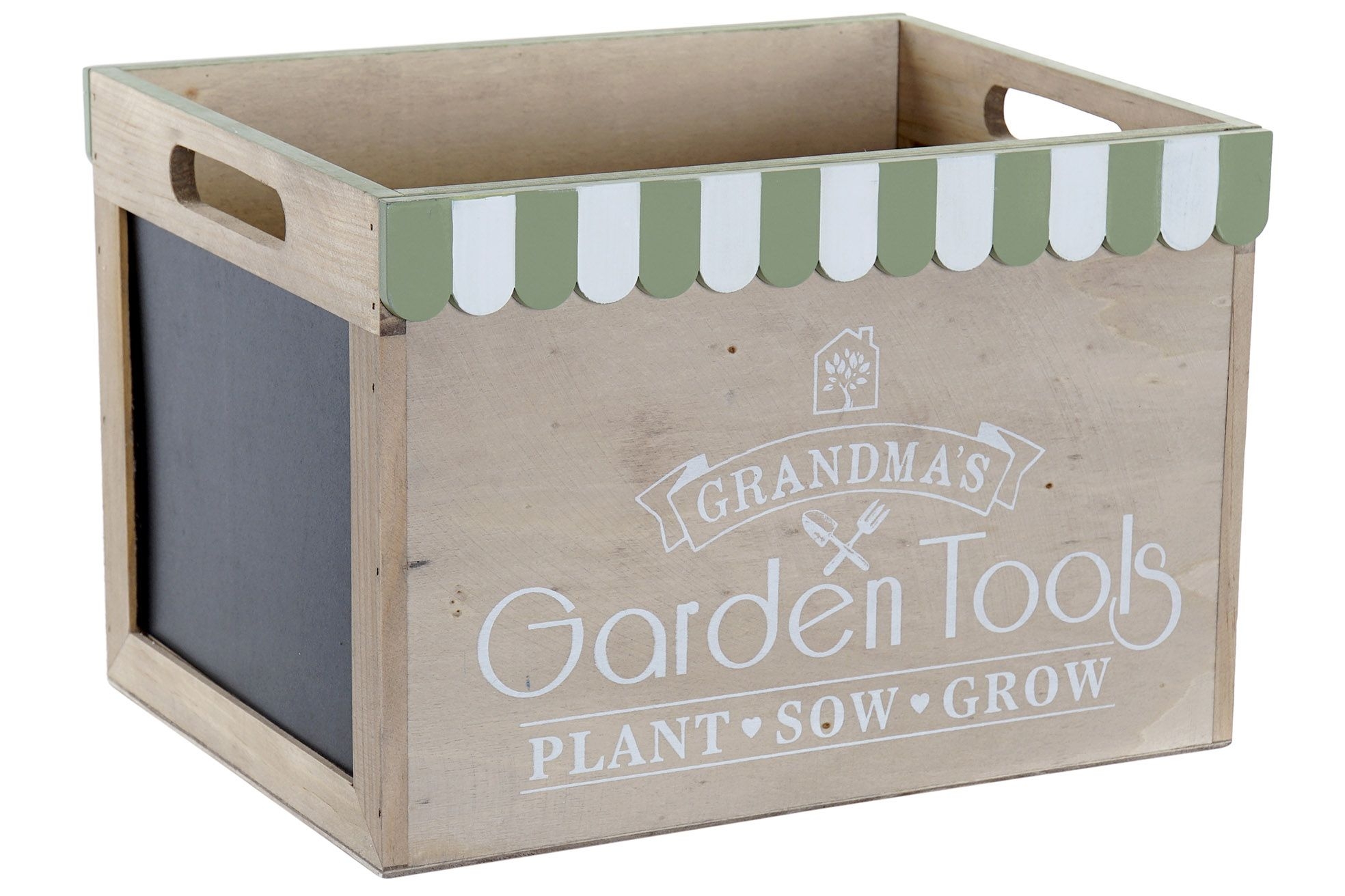 Drevená škatuľa v prírodnej farbe so zelenými dekormi, nápismi a čiernou tabuľkou na písanie kriedou. Rozmer krabice je 30x21x20 cm. Krásny doplnok do Vášho domova.
