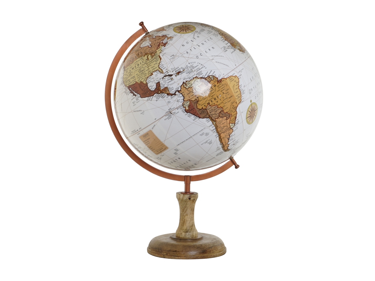Elegantný glóbus umiestnený na pevném mangovom podstavci je ideálnym doplnkom do kancelárie, obývačky alebo študovne. Jeho nadčasový dizajn spája dekoratívny a praktický prvok, ktorý zaujme každého milovníka zemepisu a interiérového štýlu.