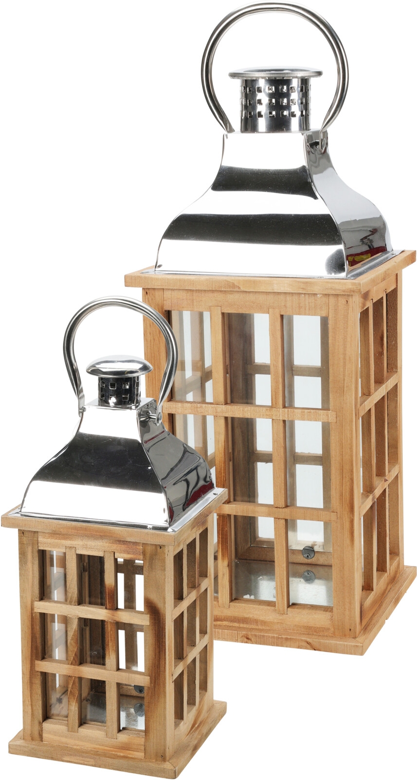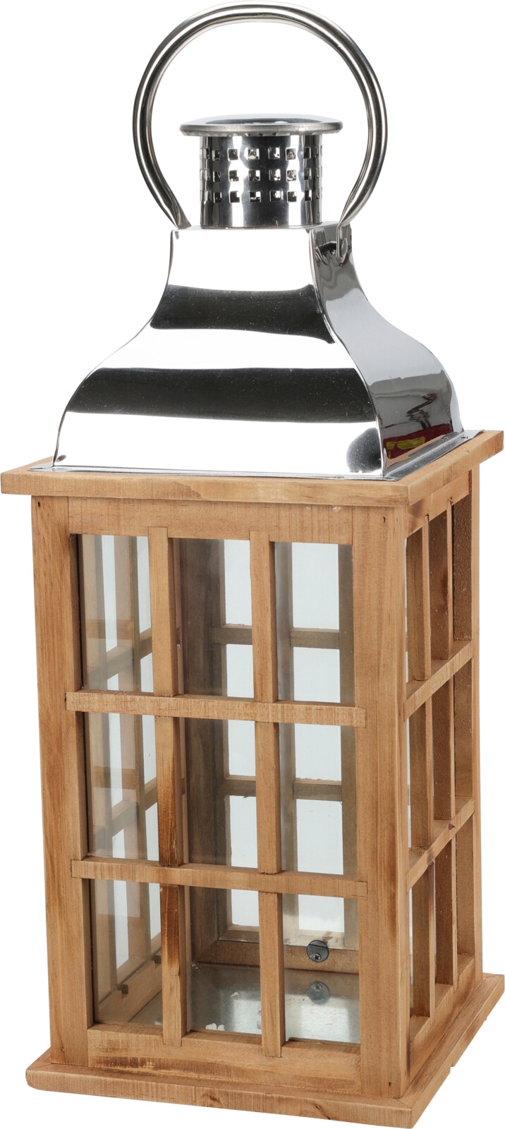 Hnedý drevený veľký lampáš so sklenenou výplňou so striebornou kovovou strieškou a rúčkou 20 x 20 x 50 cm 38838