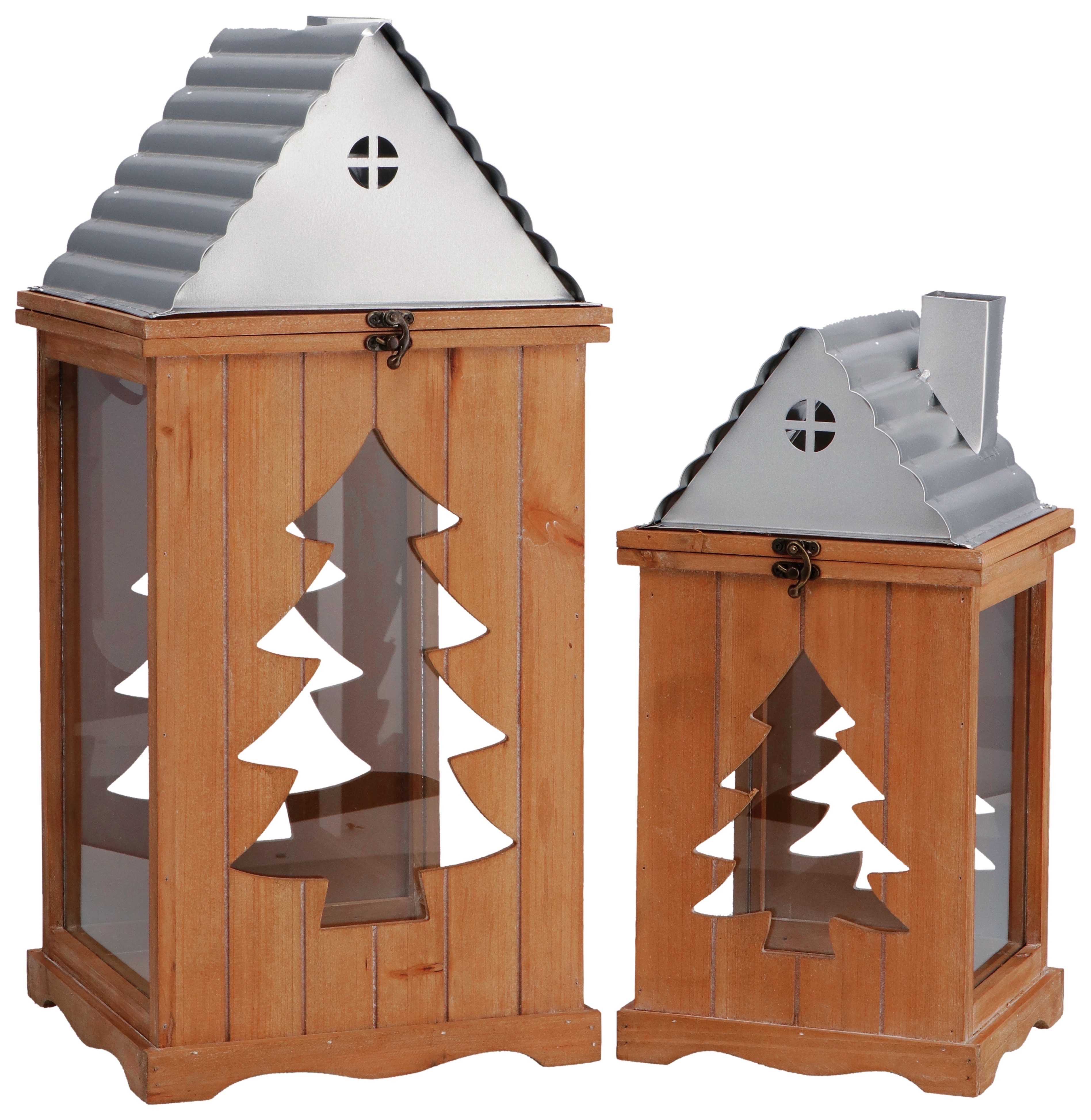 Hnedý drevený veľký lampáš so sklenenou výplňou so striebornou kovovou strieškou v tvare domčeka 44 x 61 cm 39018