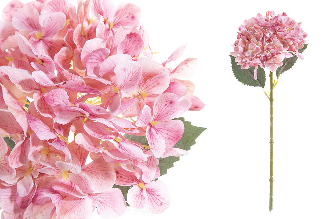 Elegantná umelá ružová hortenzia so zelenými listami na stonke. Perfektná dekorácia do vázy, na aranžmány, vence či svadobné výzdoby.