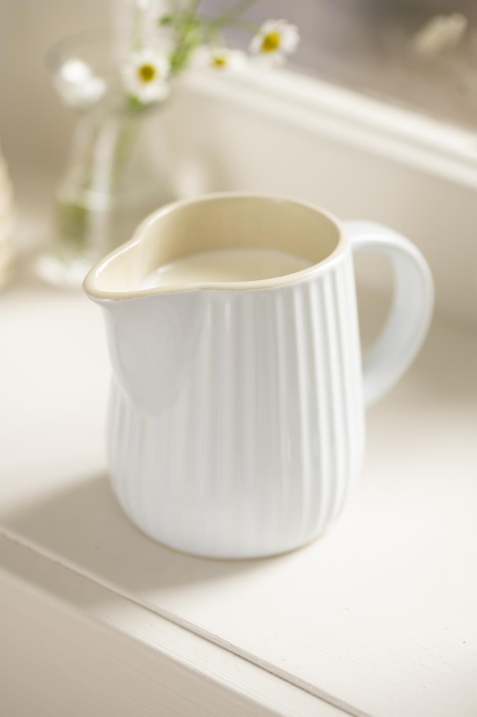 Keramický džbán na mlieko/smotanu v bielom farebnom prevedení s jednoduchým dekorovaním. Džbán je jedinečným a užitočným doplnkom do každej domácnosti. Džbán je praktický doplnok na jedálenský stôl nie len pri raňajkách. Rozmer je 7,5 x 9 x 12 cm / 200 ml.