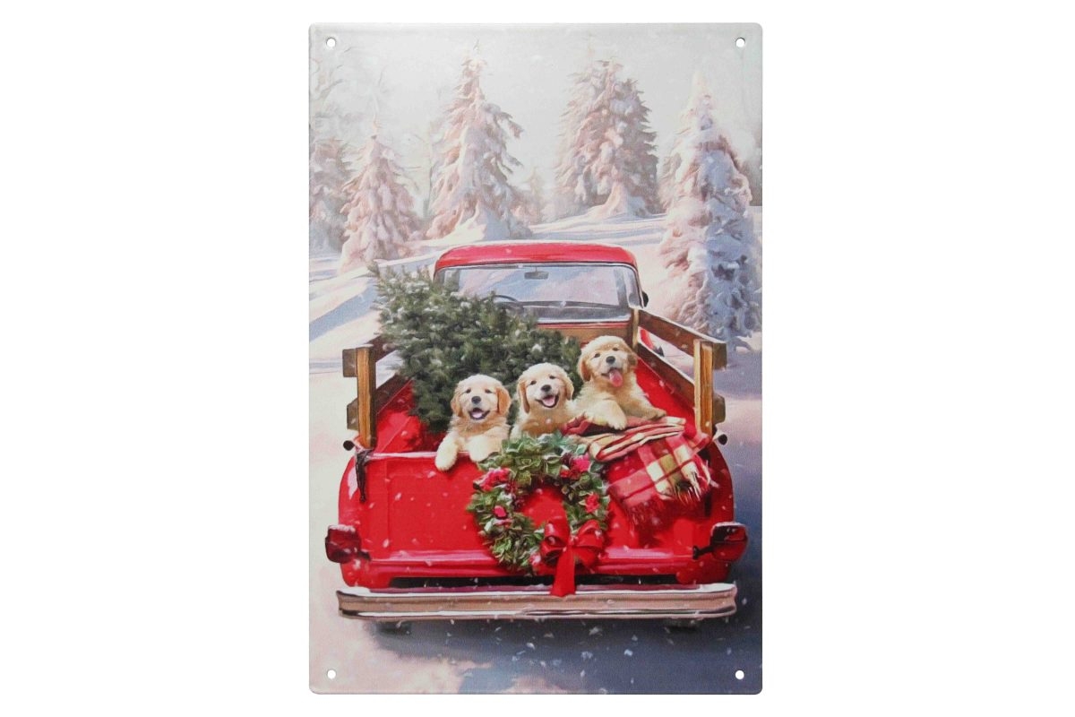 Kovová dekorácia tabuľky - obrazu s vianočným dekorom zlatých retrieverov na červenom autíčku z dielne slovinskej značky Isabelle Rose. Obraz - tabuľka je jedinečným a originálnym kúskom dekorácie do každej domácnosti. Tabuľka má veľmi prepracované detaily. Tabuľka krásne vynikne v každej miestnosti alebo na chate. Jednoduchý obraz s potlačou je jedinečným doplnkom do Vašej domácnosti. Rozmer obrazu je 20 x 30 cm.