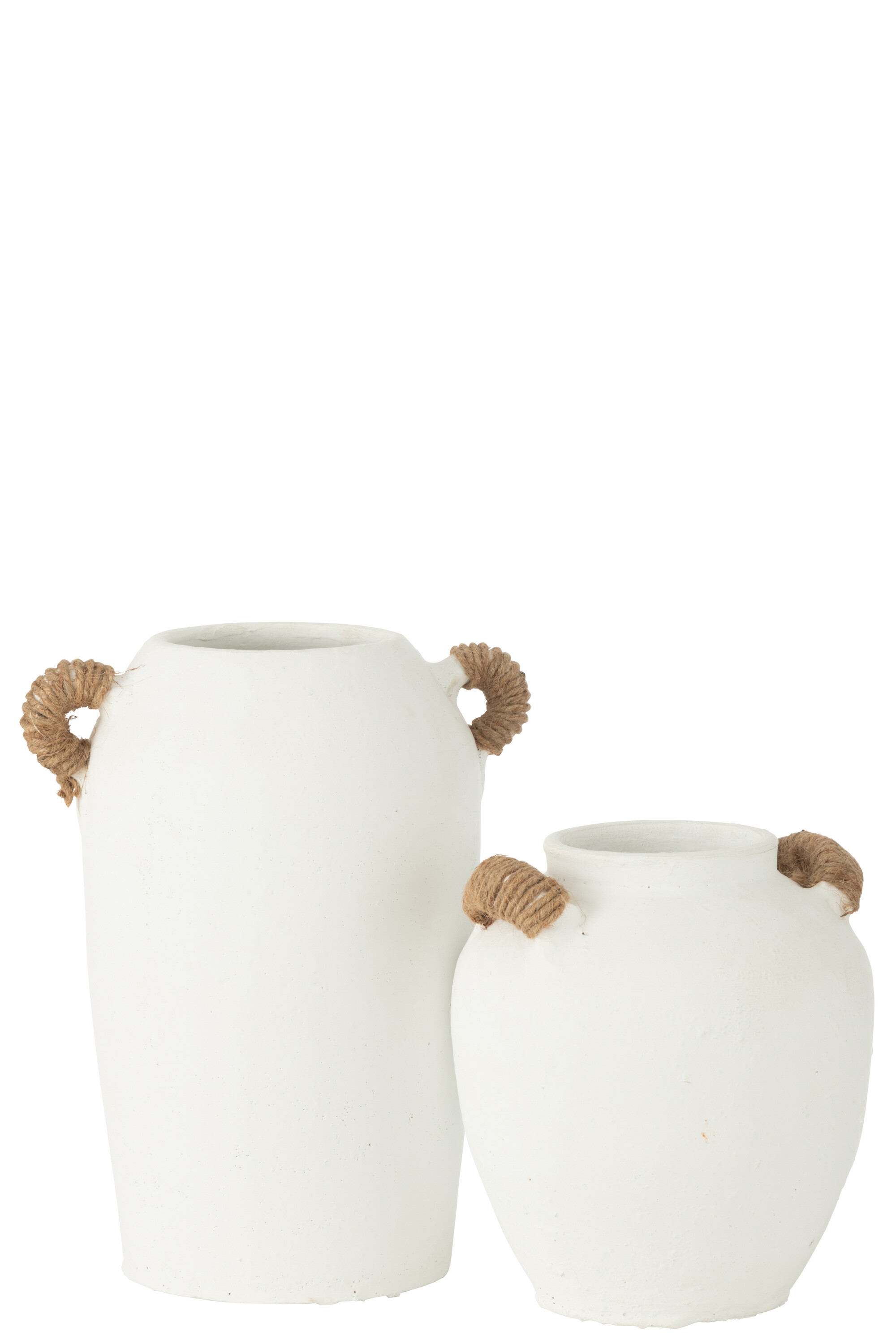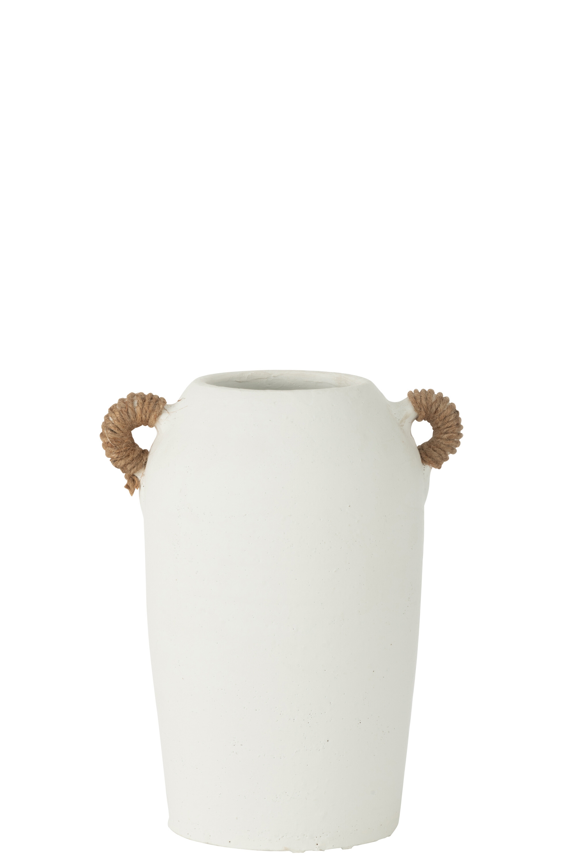 Keramická dekorácia vázy v bielom farebnom prevedení s dvomi uškami a jutovým zdobením z dielne belgickej značky Jolipa. Vďaka keramickému vzhľadu je nádherným doplnkom do Vašej domácnosti. Váza dodá Vášmu interiéru jedinečnosť. Položením viacerých váz dohromady vytvoríte krásny aranžmán na skrini alebo na stole. Naplňte túto vázu farebným (suchým) kvetom alebo prírodnými kvietkami a celok vytvorí krásnu kyticu. Rozmer vázy je 15 x 13 x 25 cm.