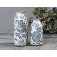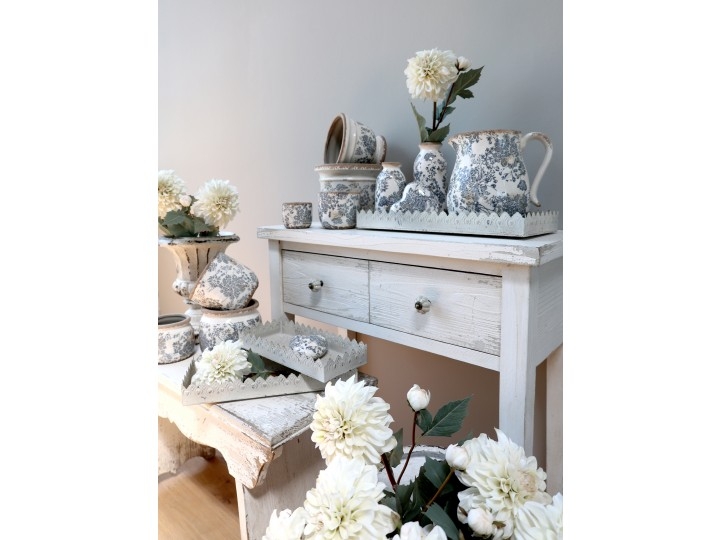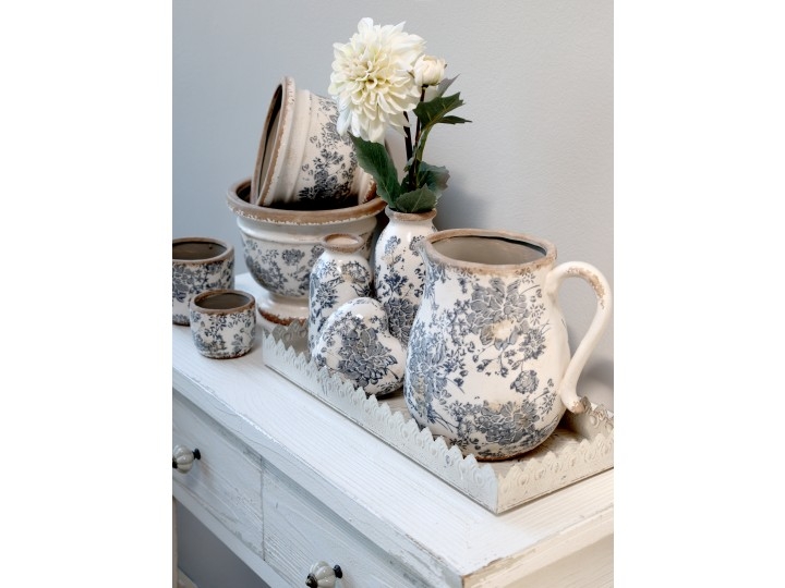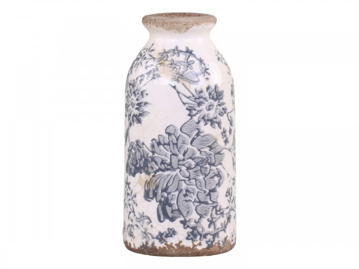 Keramická krémová váza s obitým vzhľadom s dekorom modrých kvetov vo vintage štýle z dielne dánskej značky Chic Antique. Váza má jednoduchý vzhľad vo vintage provensálskom štýle.