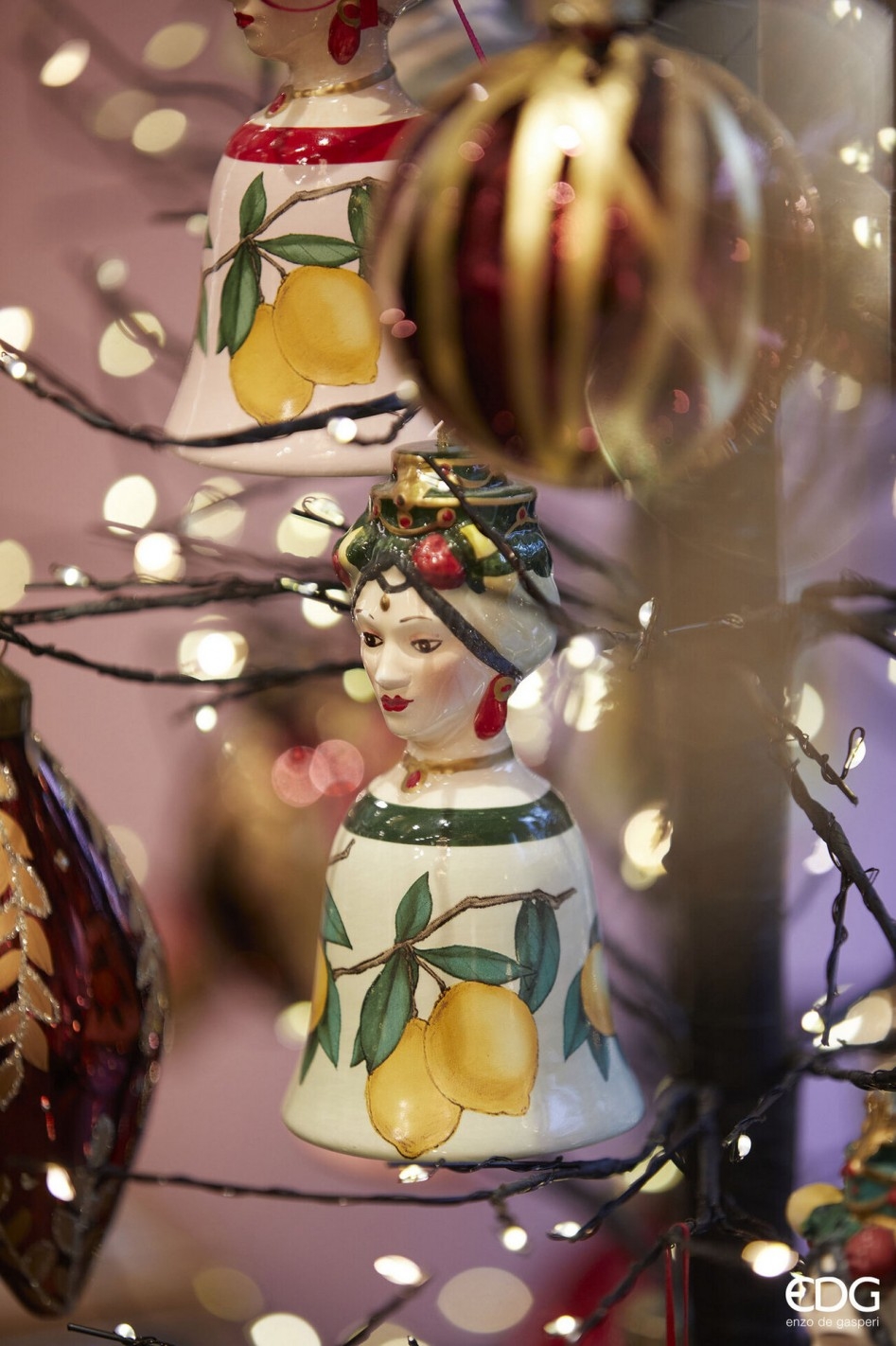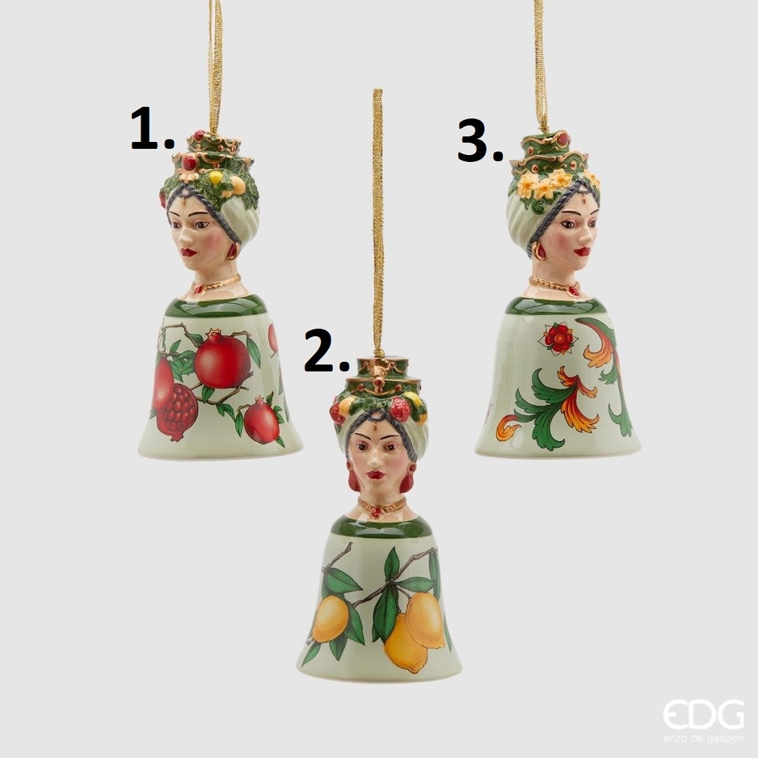 Keramická závesná dekorácia hlavy ženy so zvončekom a dekorom ovocia v troch prevedeniach zo sicílskej kolekcie z dielne talianskej značky Enzo De Gasperi. Závesná ozdoba je milá nie len vianočná dekorácia. Ozdoba do bytu navodí tú správnu atmosféru. Veľkosť jednej ozdoby je 13 cm. Materiál: Keramika.