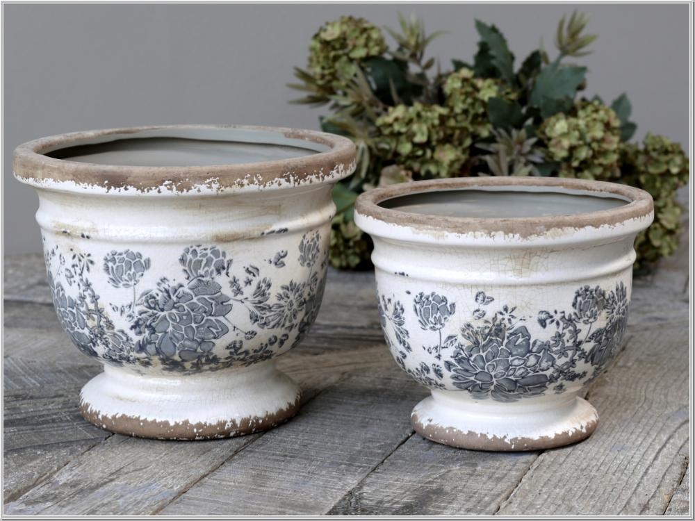 Keramický krémový kvetináč s obitým vzhľadom s dekorom modrých kvietkov vo vintage štýle z dielne dánskej značky Chic Antique. Kvetináč je vyhotovený vo vintage štýle s obitým efektom. Môže slúžiť ako obal, alebo na priame vysádzanie rastliny s použitím drenáže (napríklad keramzit). Kvetináč je vhodný do interiéru, ktorý so sebou prinesie vintage provensálsky štýl. Rozmer kvetináča (priemer a výška): 17,5 x 14,5 cm.