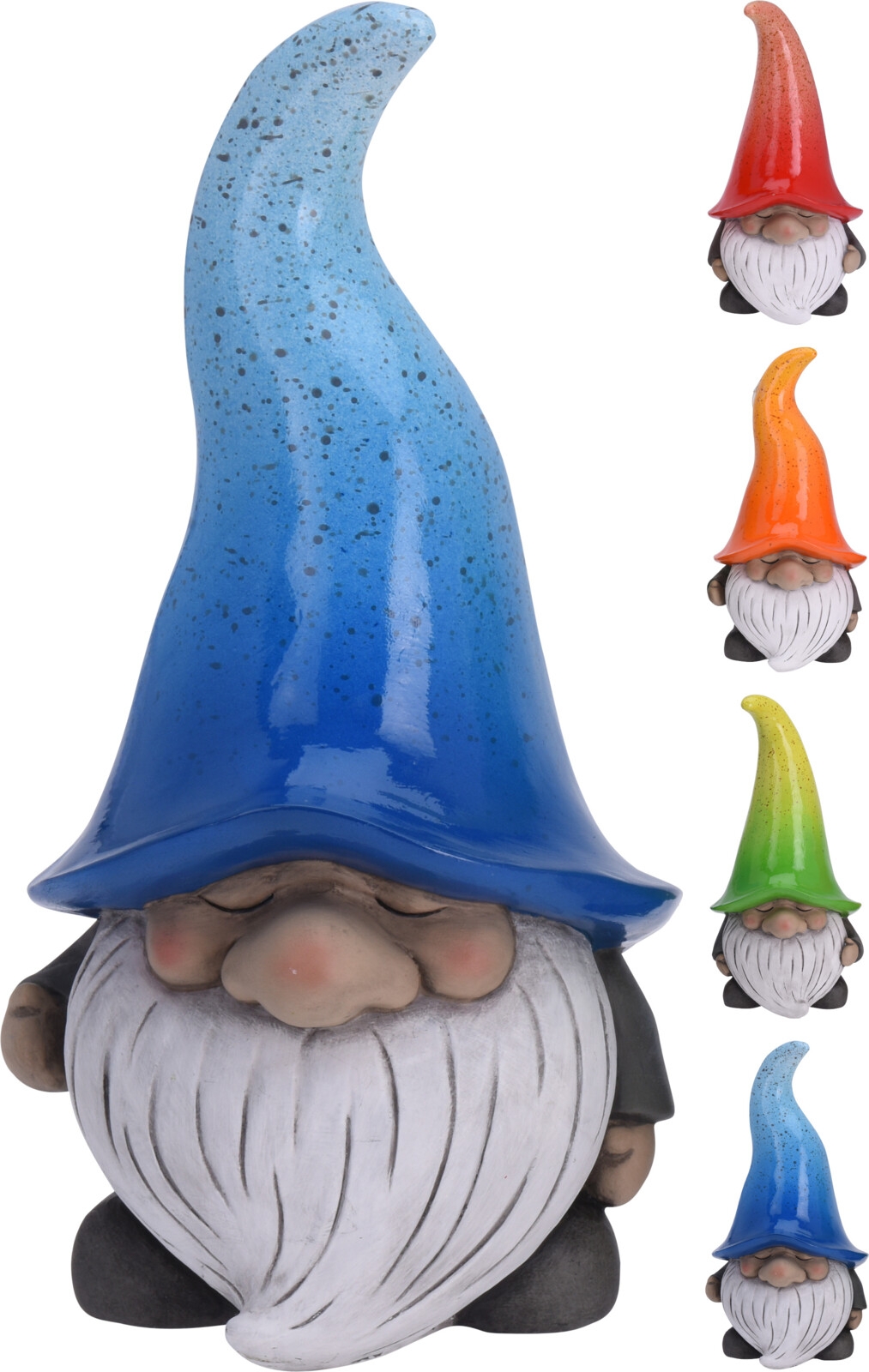 Veľmi milá keramická záhradná dekorácia - trpaslík s vysokou farebnou čiapkou, dlhou bradou a guľatým noštekom. Trpaslík do záhrady je na výber zo štyroch farebných prevedení.