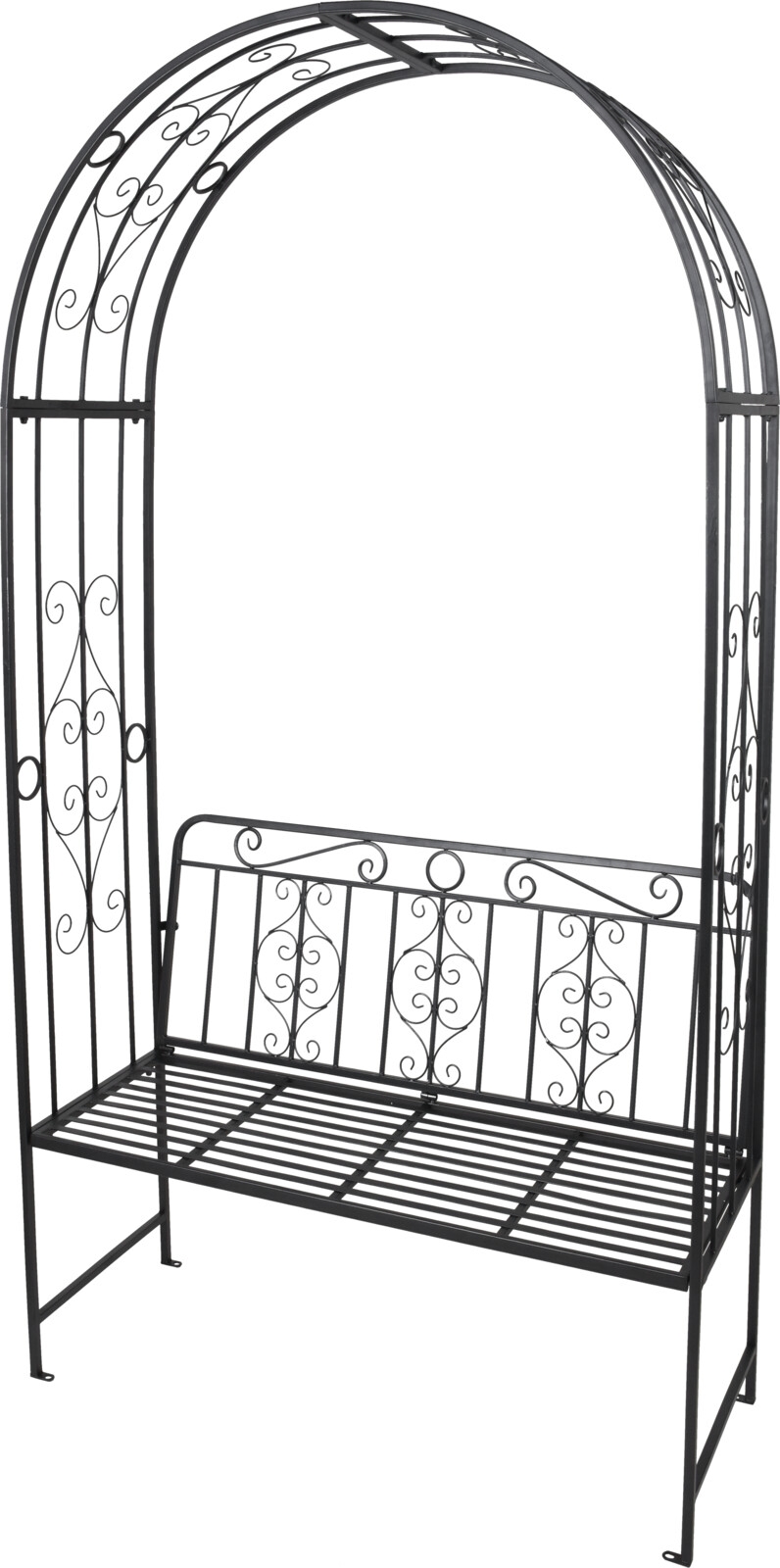 Kovová čierna záhradná lavička s oblúkom na oporu ťahavých rastlín 121 x 53 x 230 cm 37163