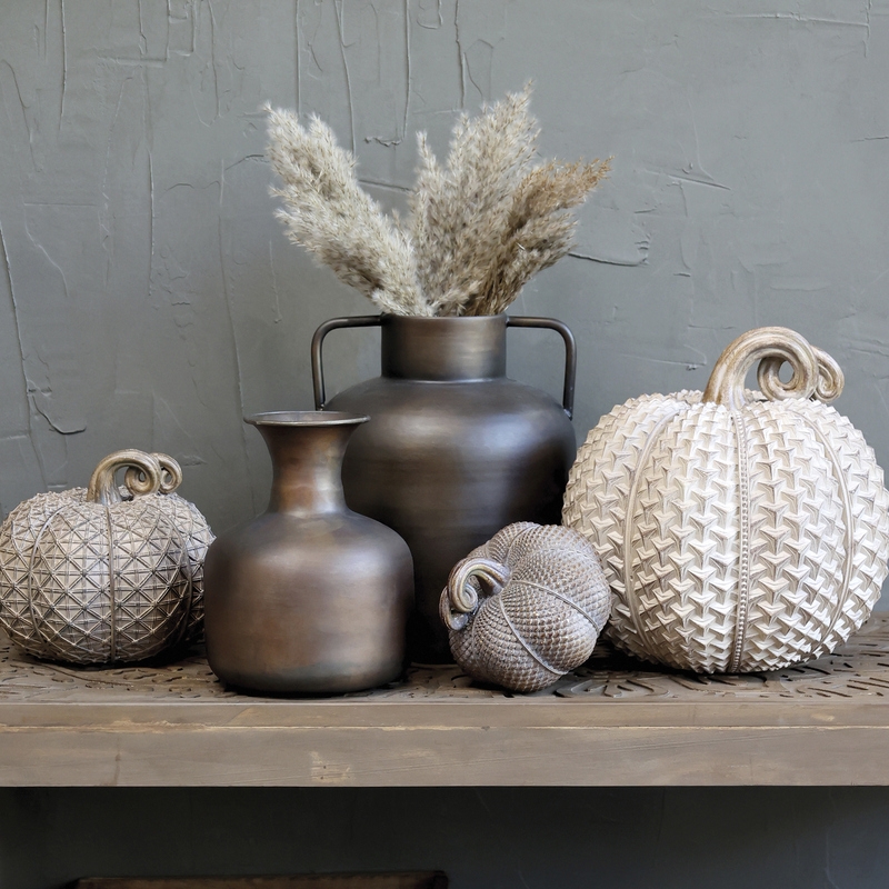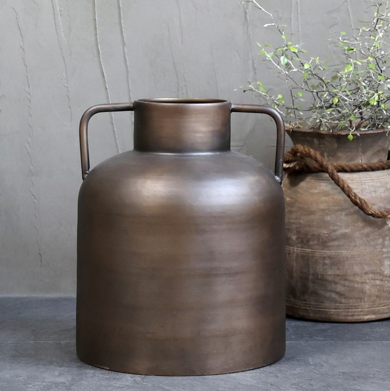 Kovová dekorácia vázy v medenom farebnom prevedení s dvomi rúčkami v jednoduchom štýle z dielna dánskej značky Chic Antique. Váza je vhodná do interiéru, aj do krytého exteriéru. Krásne v nej vyniknú Vaše umelé kvietky alebo dlhé trávy. Vďaka kovovému medenému vzhľadu je nádherným doplnkom do Vašej domácnosti. Rozmer vázy je 24 x 28 cm.