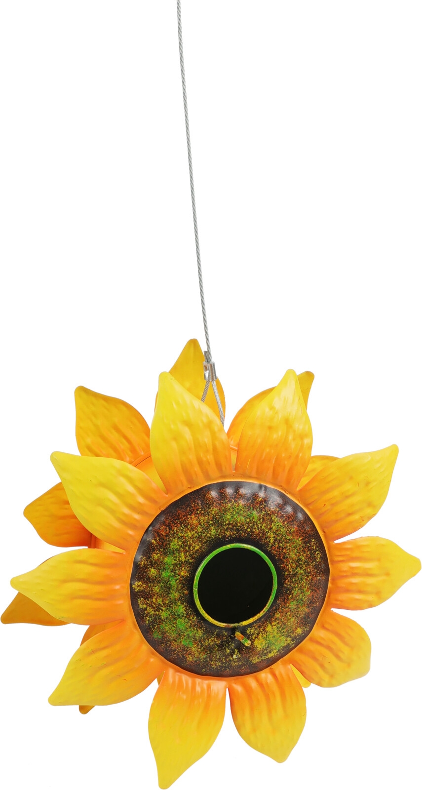 Kovová záhradná dekorácia domčeka - búdky pre vtáčika v tvare slnečnice je jedinečným a originálnym kúskom do Vašej záhrady pre krásne ubytovanie vtáčikom. Veselý farebný prístrešok pre malé až stredne veľké vtáčiky bude pútať pozornosť. Spriateľte sa s prírodou aj Vy a ponúknite elegantný domov pre operených cestovateľov. Búdka Vám bude skrášľovať Vašu záhradku a operený priateľ Vám bude vďačne vyspevovať. Rozmer vtáčej búdky je 22,5 cm x 64 cm.