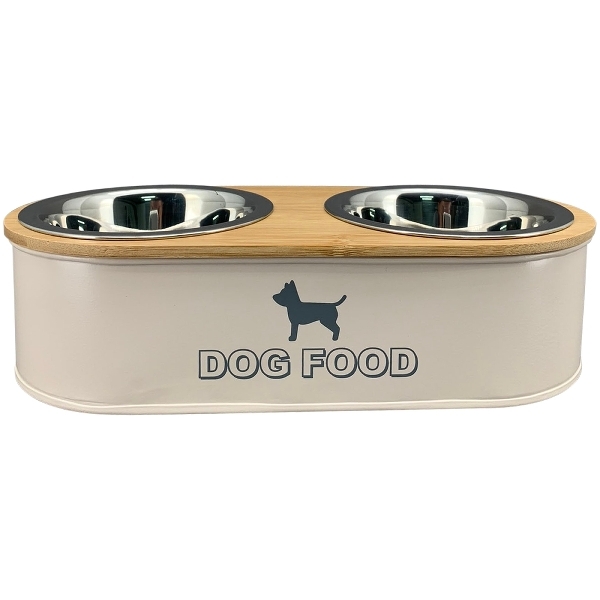 Kovovo-drevený stojan v béžovom farebnom prevedení s dvomi striebornými miskami pre psíka s nápisom DOG FOOD 30 x 13,5 x 7,2 cm 44712