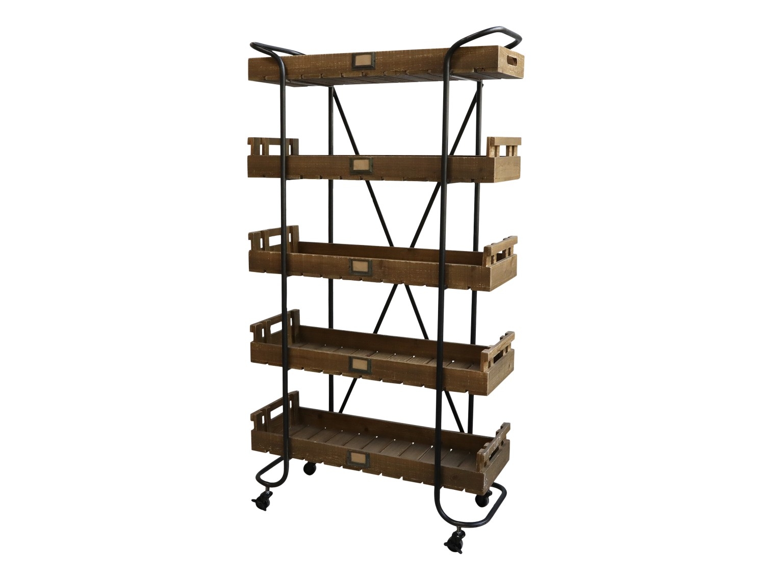 Kovový čierny stojan - vozík na kolieskach s piatimi drevenými podnosmi 83 x 34 x 156,5 cm Chic Antique 39157