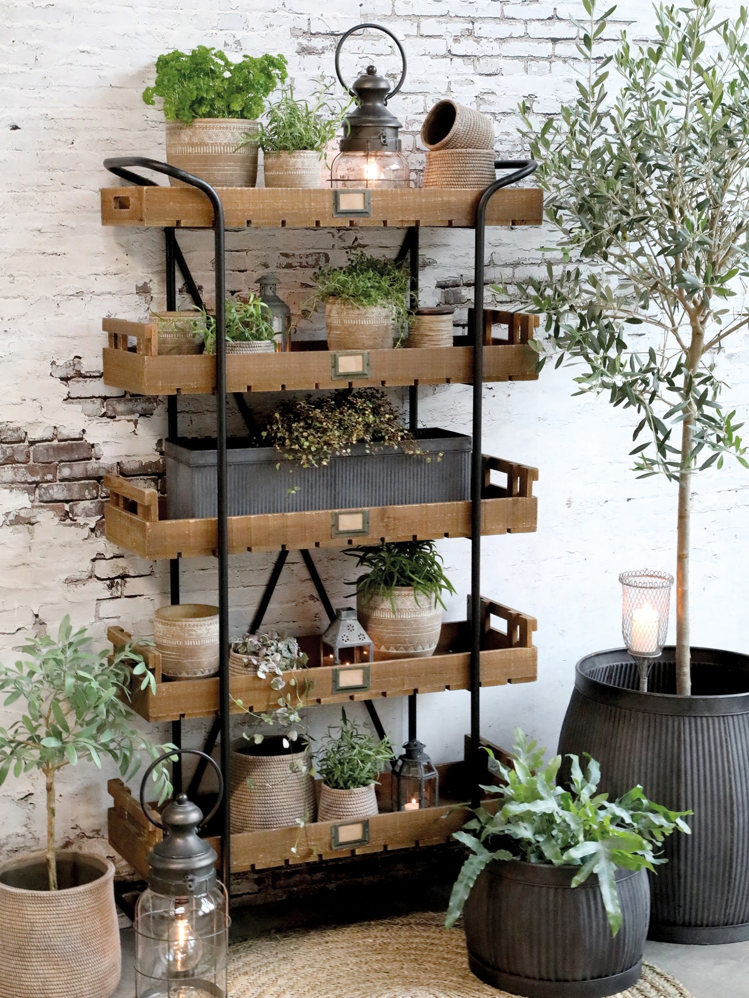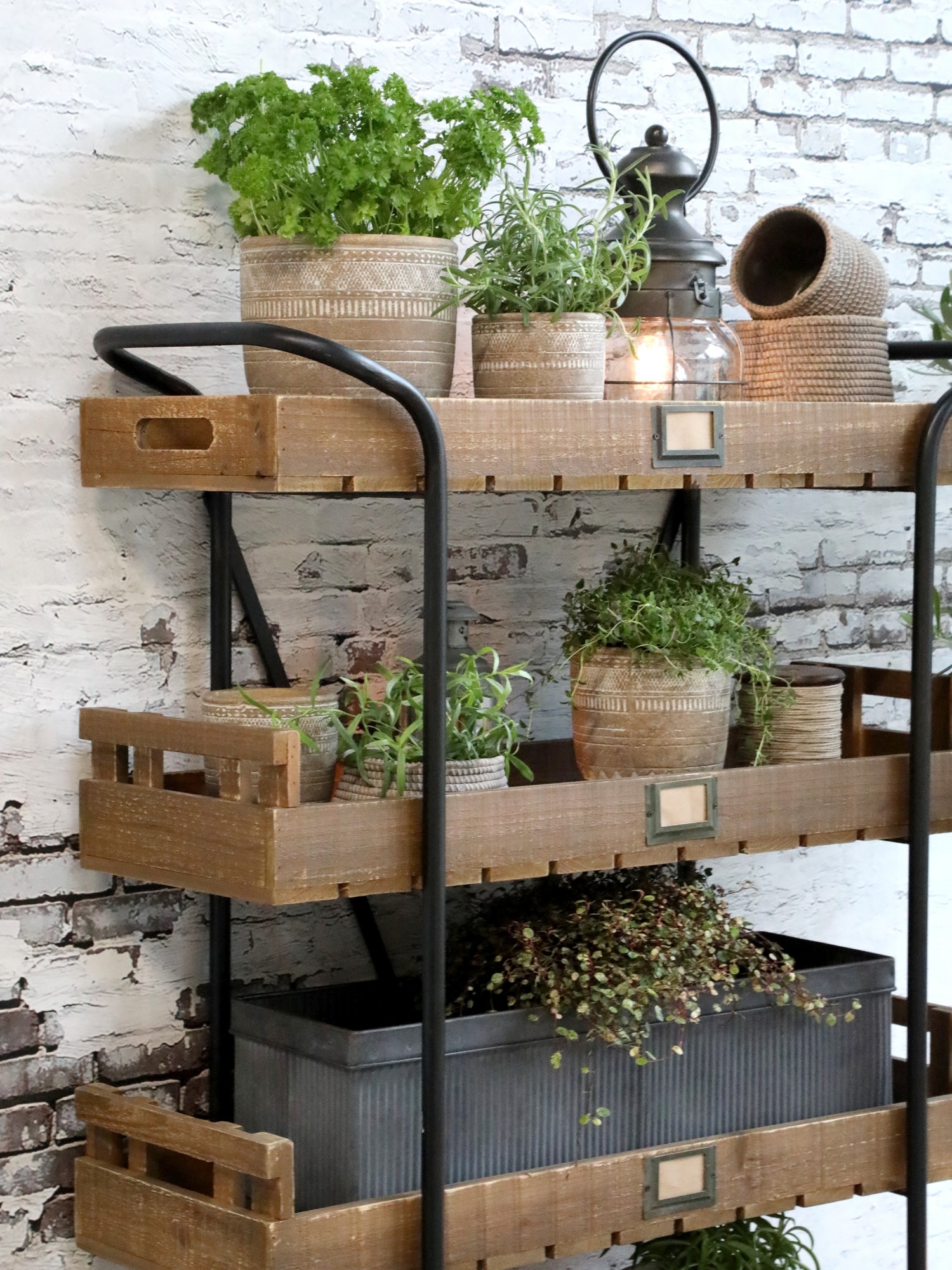 Kovový čierny stojan - vozík na kolieskach s piatimi drevenými podnosmi z dielne dánskej značky Chic Antique . Stojan je krásnym doplnkom do každej domácnosti na dekorácie alebo na izbové kvety. Stojan sa dá ľahko presúvať z jedného miesta na druhé vďaka kolieskam. Rozmer stojana je 83 x 34 x 156,5 cm. Materiál: Kov a drevo.