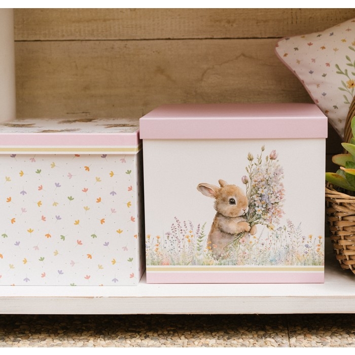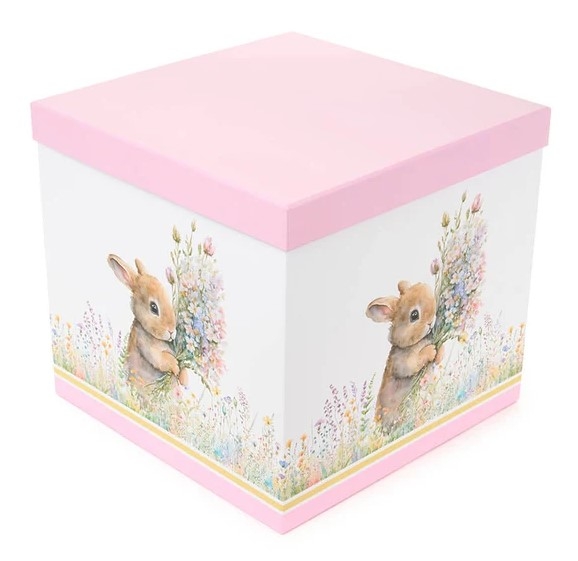 Kartónová dekorácia boxu v bielo-ružovom farebnom prevedení s dekorom zajačikov z dielne talianskej značky Nuvole di Stoffa. Box je skvelým a jedinečným úložným priestorom či už na drobnosti alebo aj na väčšie predmety. Papierový box s vekom na uskladňovanie. Široké spektrum využitia. Rozmer boxu je 25 cm.