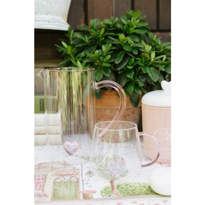 Sklenený džbán v transparentnom farebnom prevedení s dekorom ružového srdiečka v talianskej značky Nuvole di Stoffa. Džbán je originálnym a užitočným pomocníkom do každej domácnosti. Vďaka originálnemu vzhľadu vyzerá džbán esteticky krásne. Džbán je dobre kombinovateľný s inými kuchynskými potrebami z tejto neodolateľnej edície. Objem džbána je 1200 ml.