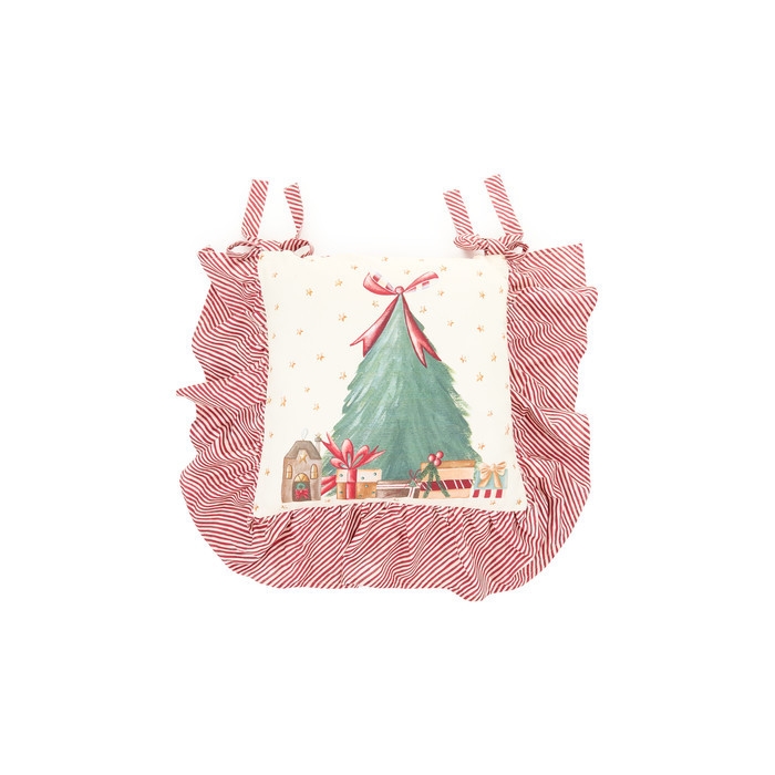 Bavlnený podsedák s vianočným dekorovaním a volánikovým lemovaním z dielne talianskej značky Nuvole di Stoffa. Dodajte svojim stoličkám v kuchyni, obývačke alebo dokonca na záhrade nádych triedy a modernosti. Je vybavená veľmi praktickými šnúrkami, takže si ich môžete okolo stoličky uviazať a zabezpečiť, aby sa nešmýkali. Rozmer podsedáku je 40 x 40 cm.