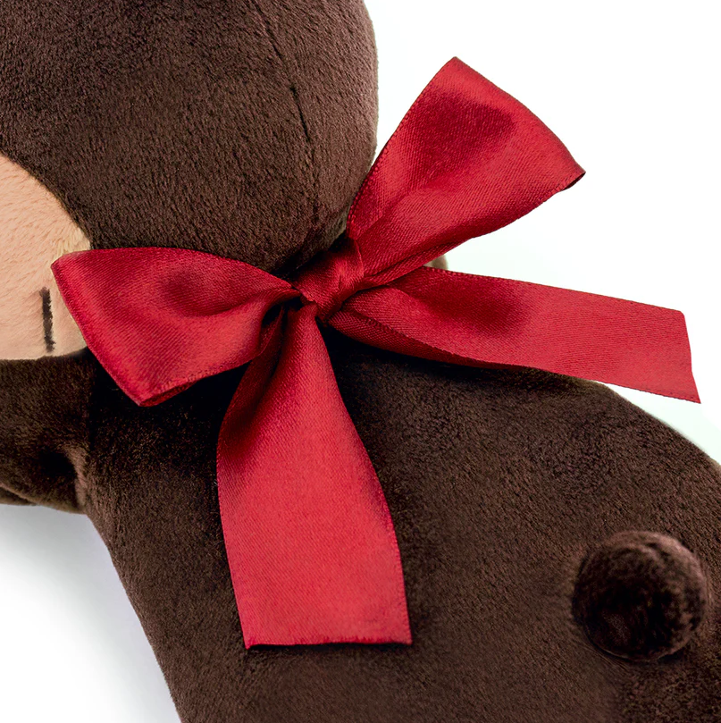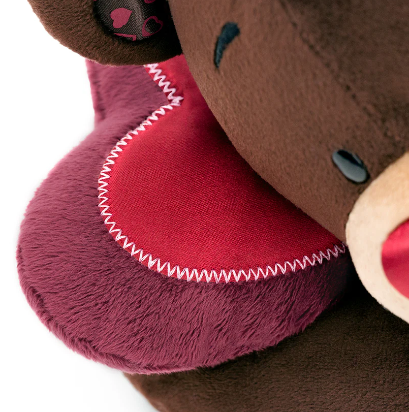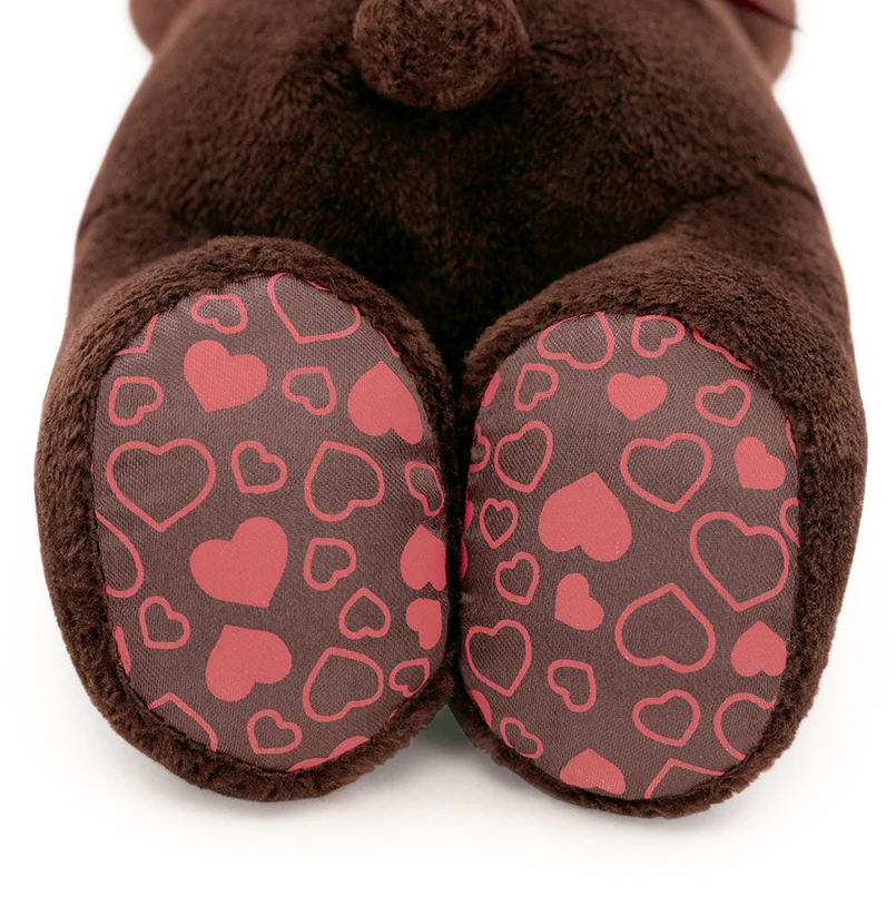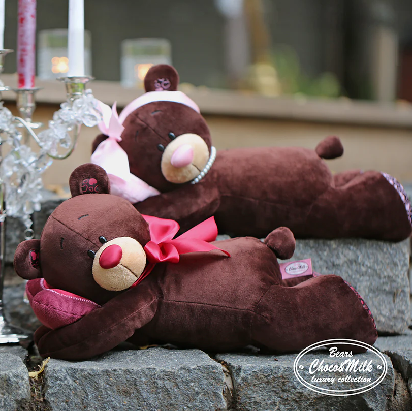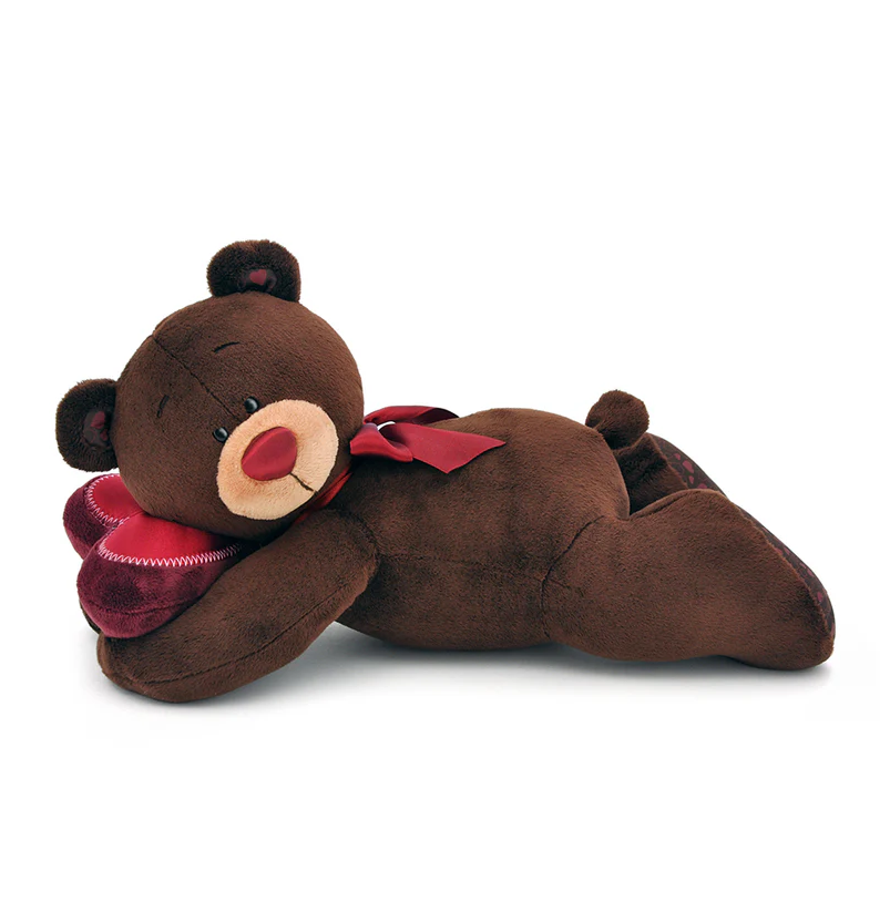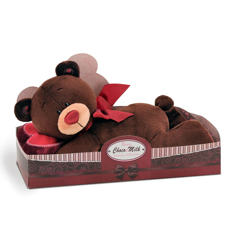 Plyšová dekorácia ležiaceho medvedíka Choco sleeping v hnedom farebnom prevedení s červenou mašličkou a červeným srdiečkom. Kolekcia dvoch najrozkošnejších a najštýlovejších medvedíkov čokoládovej farby s malými saténovými srdiečkami na chodidlách a ušiach: chlapček Choco a dievčatko Milk.
