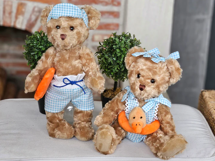 Zažite dobrodružstvo s týmto úžasným a jedinečným párom plyšových medvedíkov v plážovom bielo-modrom oblečení.