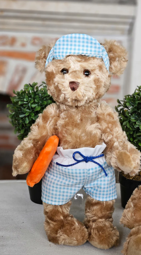 Plyšová dekorácia hnedého medvedíka alebo medvedice v plážovom bielo-modrom oblečení z dielne belgickej značky La Galleria.