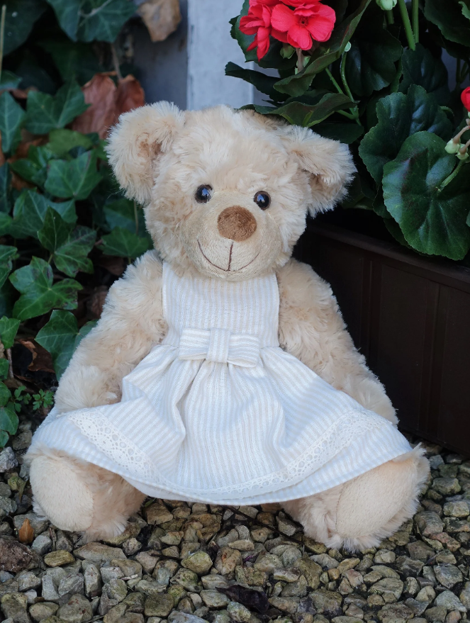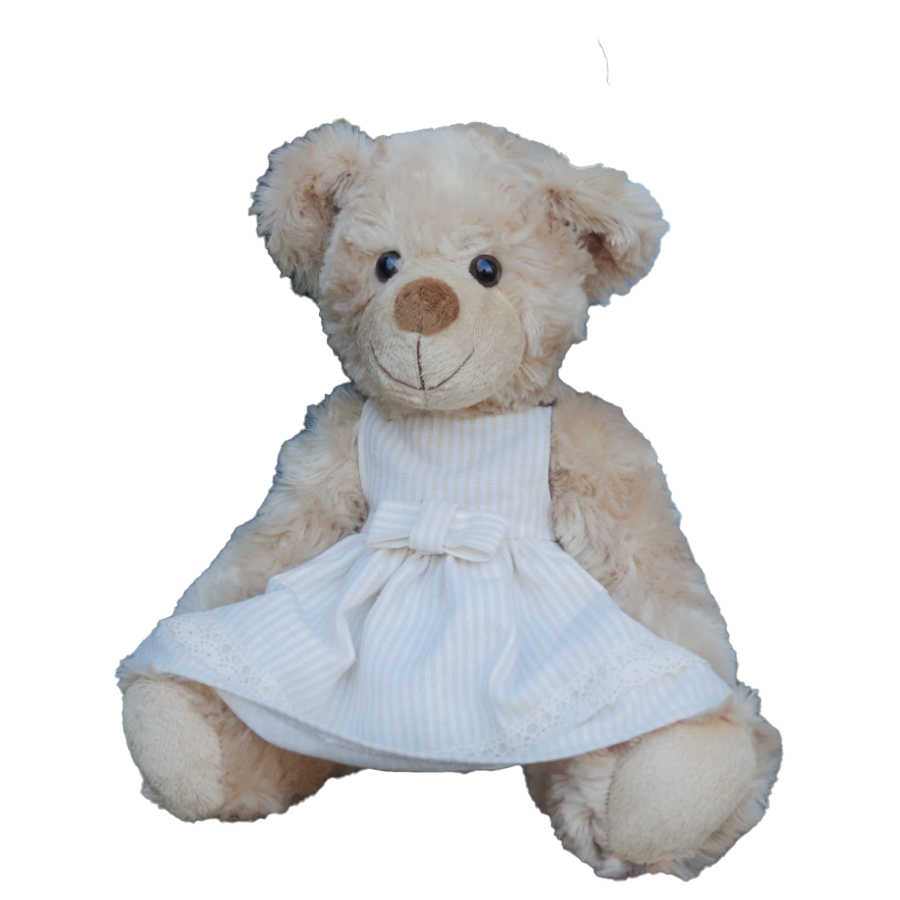 Zažite dobrodružstvo s týmto úžasným a jedinečným medvedíkom v béžových šatôčkach s mašličkou.