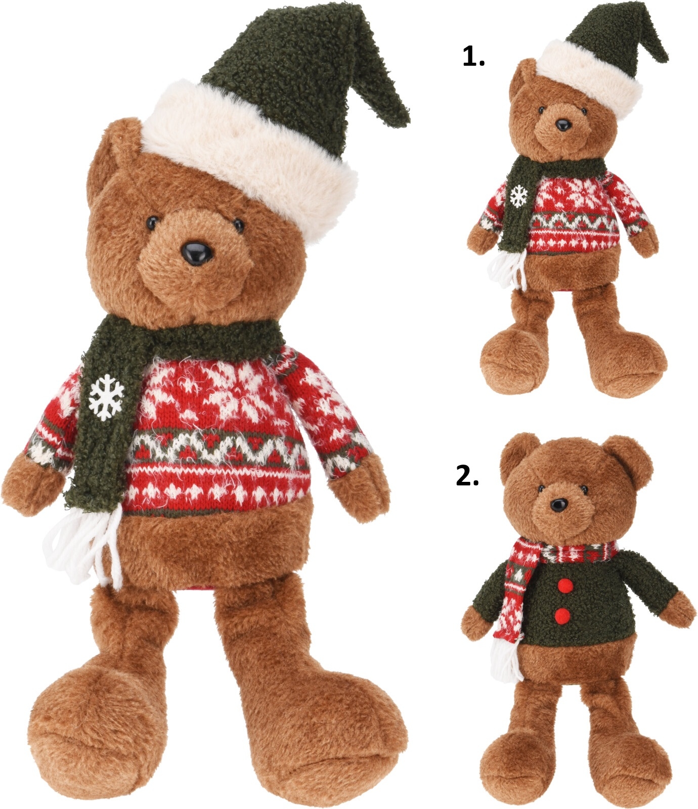 Plyšová dekorácia sediaceho medvedíka v hnedom farebnom prevedení vo vianočnom oblečení v dvoch prevedeniach 33 cm 44772