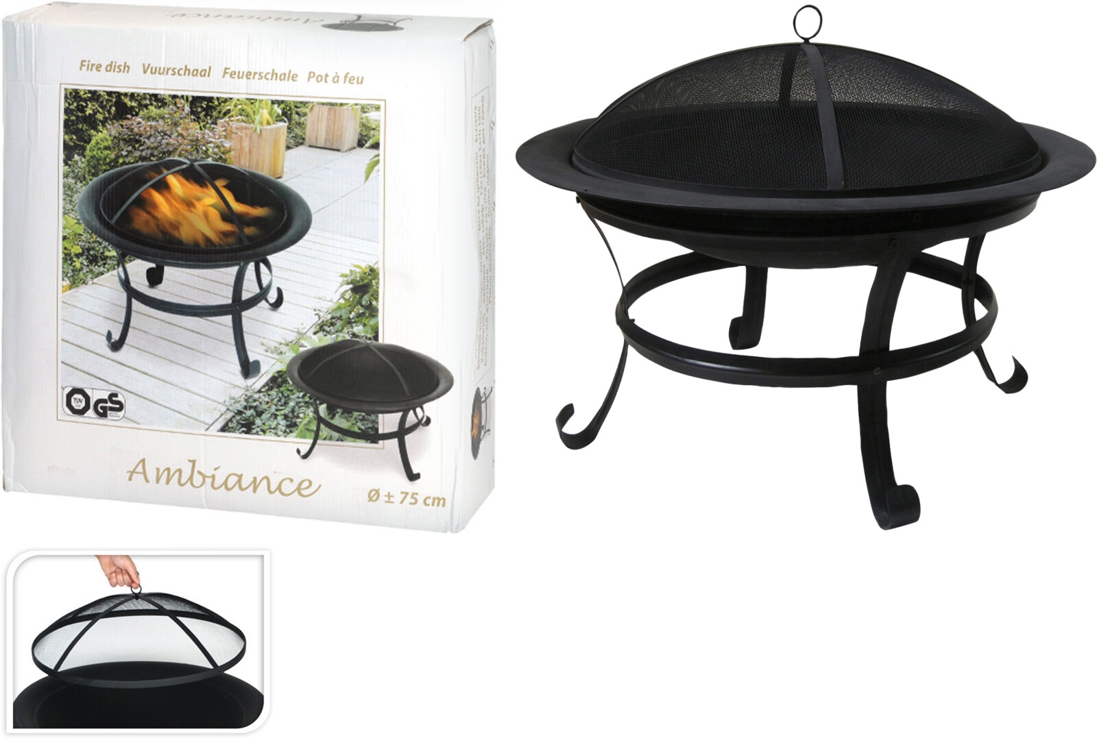 Polguľovité čierne ohnisko s vekom na štyroch nôžkach. Ohnisko je kompletne zhotovené z ocele a má tepelne odolný čierny náter. Dobrá stabilita vďaka štyrom nohám spojených rámom. Tvarovaný drôtený poklop s úchytom zvyšuje bezpečnosť, slúži ako ochrana pred iskrami. Ohnisko je ideálne na záhradu, terasu i balkón. Ohnisko s poklopom možno využiť zároveň ako záhradný krb, pretože umožňuje dobré okolité šírenie tepla. Rozmer ohniska je 76,5 x 16,5 x 75 cm.