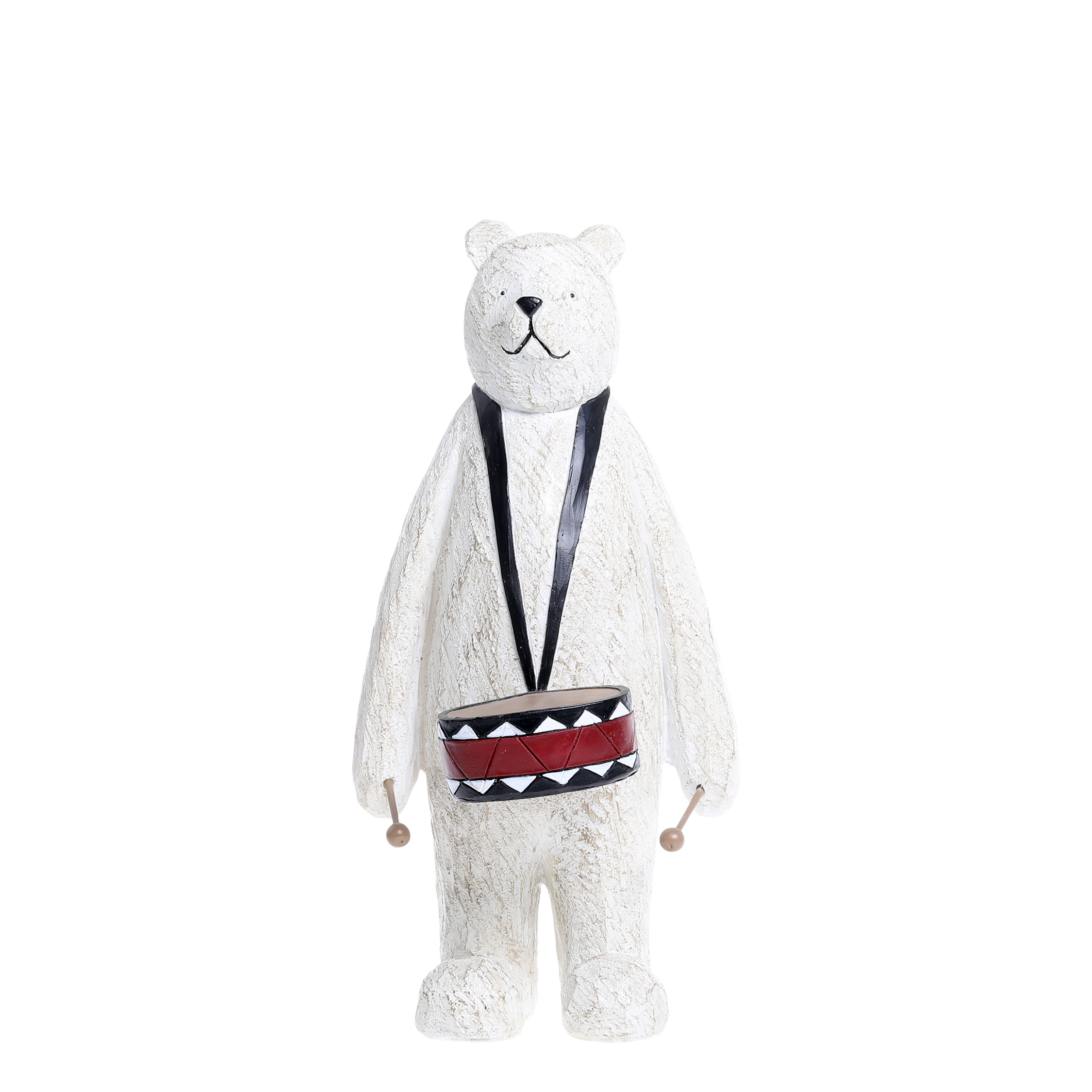 Polyresinová dekorácia postavičky medvedíka v bielom farebnom prevedení s bubnom a paličkami 12,5 x 12 x 25 cm Chic Antique 45145