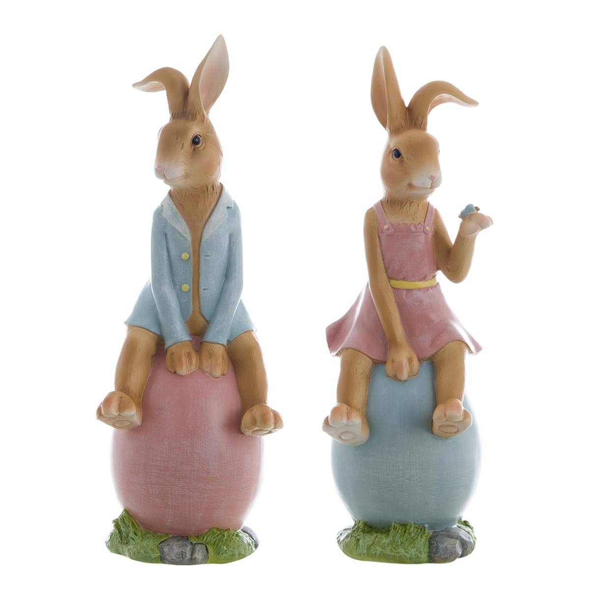 Polyresinová dekorácia postavičky zajačika alebo zajačice sediacich na vajíčku 11 x 13 x 32 cm Blanc Maricló 42557
