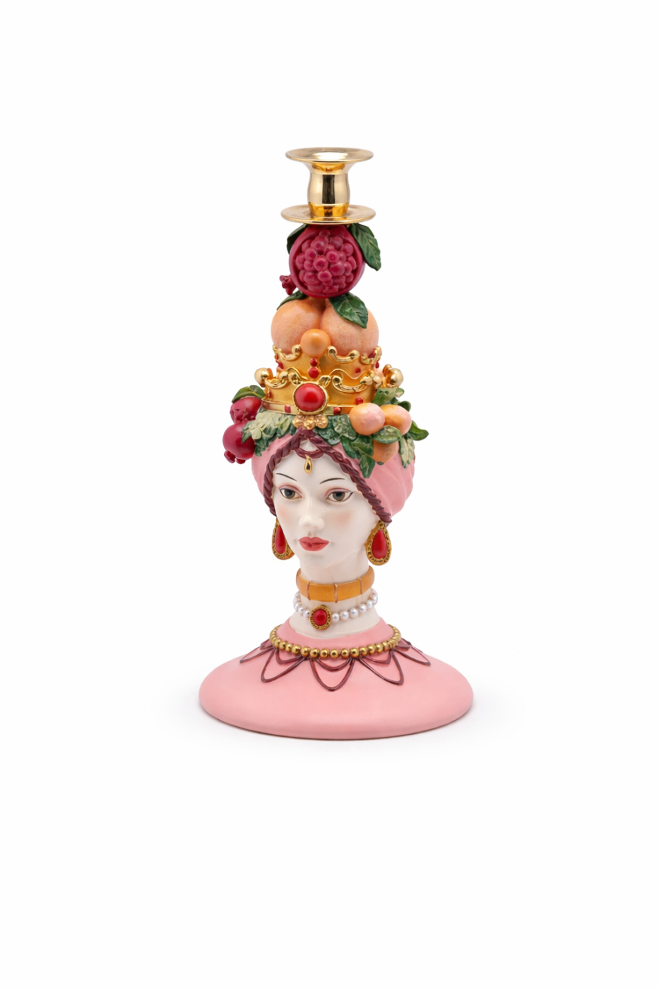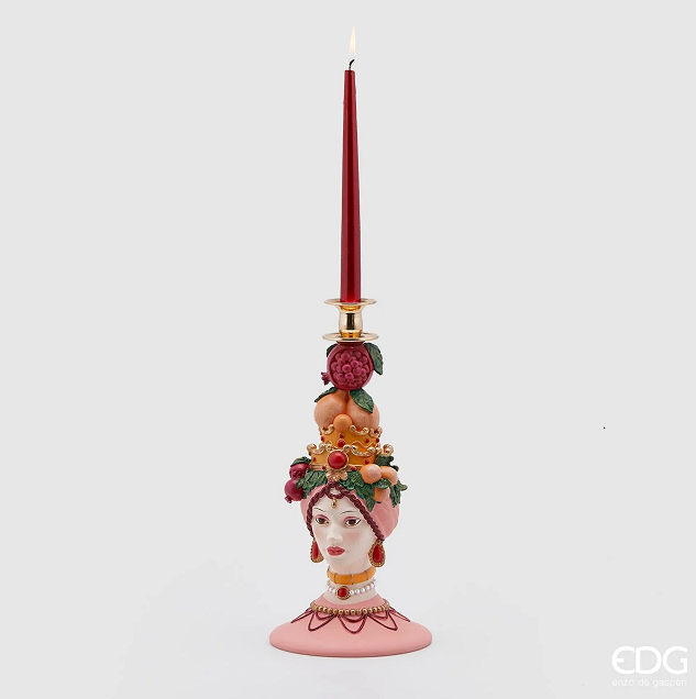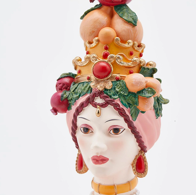 Polyresinová dekorácia svietnika na vysokú sviečku v tvare hlavy ženy s dekorom pomarančov a granátového jablka zo sicílskej kolekcie 17 x 36 cm EDG 42043