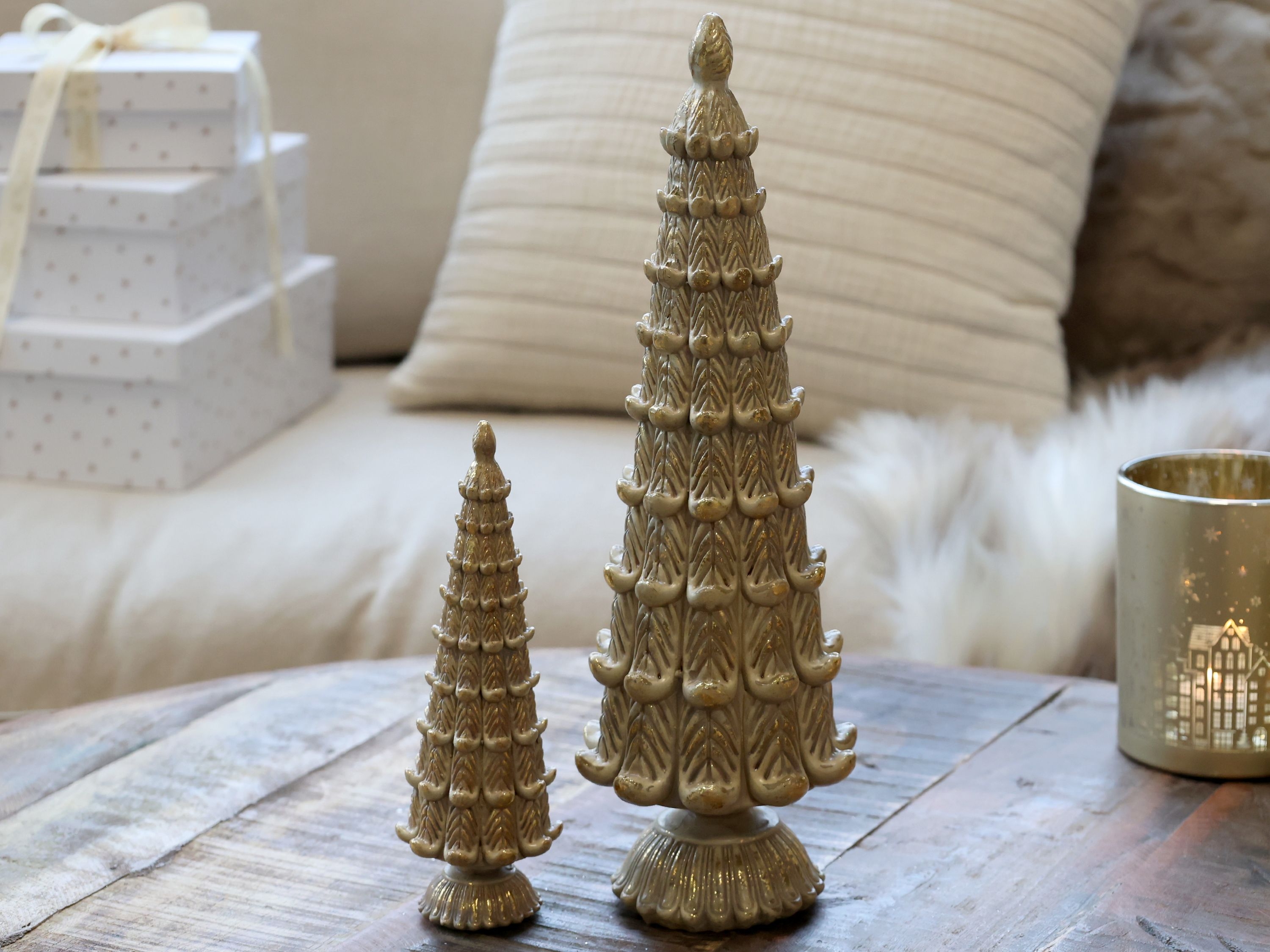 Polyresinová dekorácia vianočného stromčeka v kávovom farebnom prevedení na podstavci 10 x 35 cm Chic Antique 45148