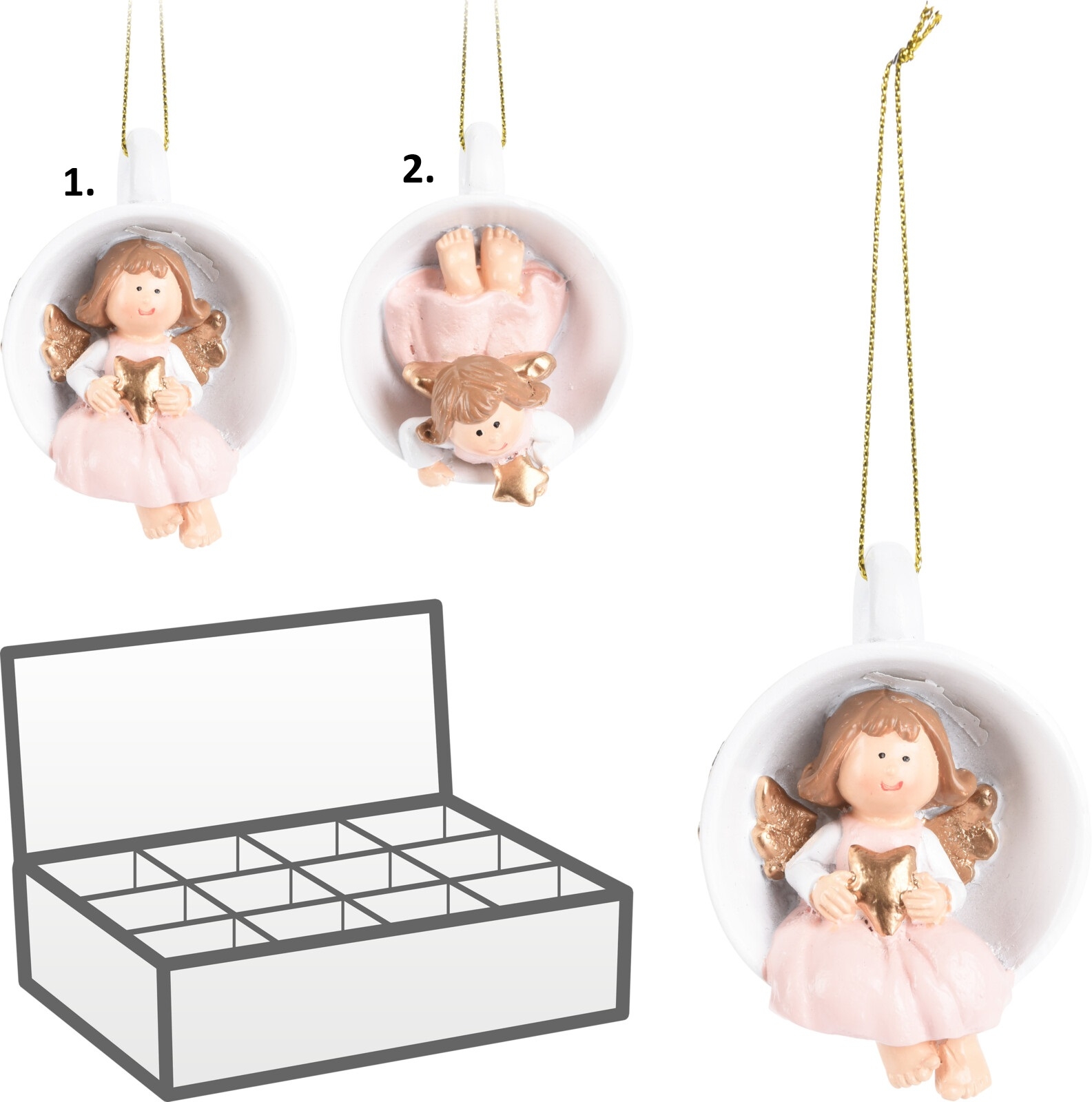 Polyresinová závesná dekorácia anjelika v ružovom farebnom prevedení v šálke na zlatej šnúrke v dvoch prevedeniach 8x6x4 cm 44660