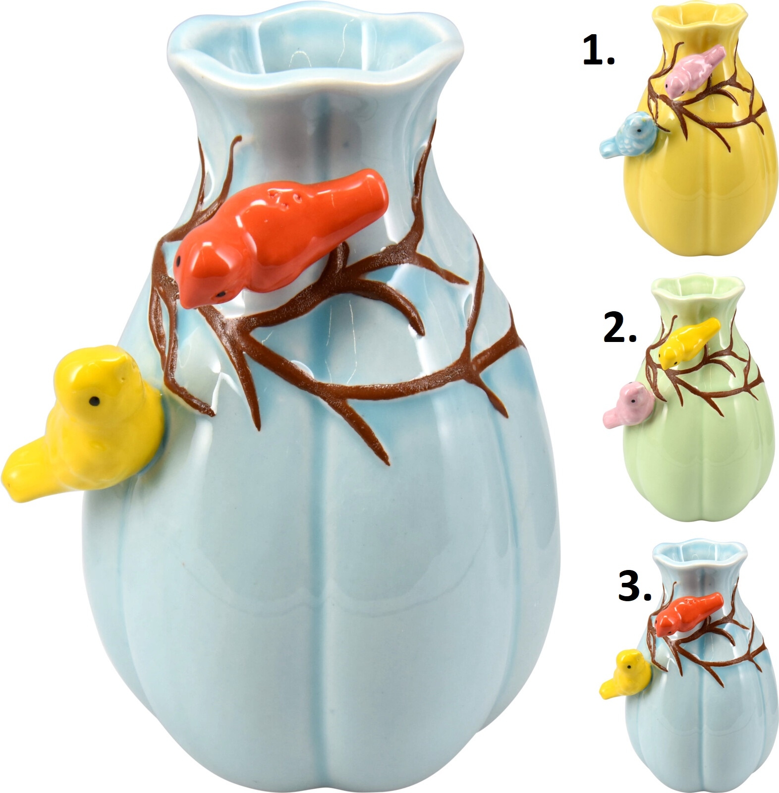 Porcelánová dekorácia vázy v troch farebných prevedeniach s dekorom vtáčikov s konárom 14 cm 43149