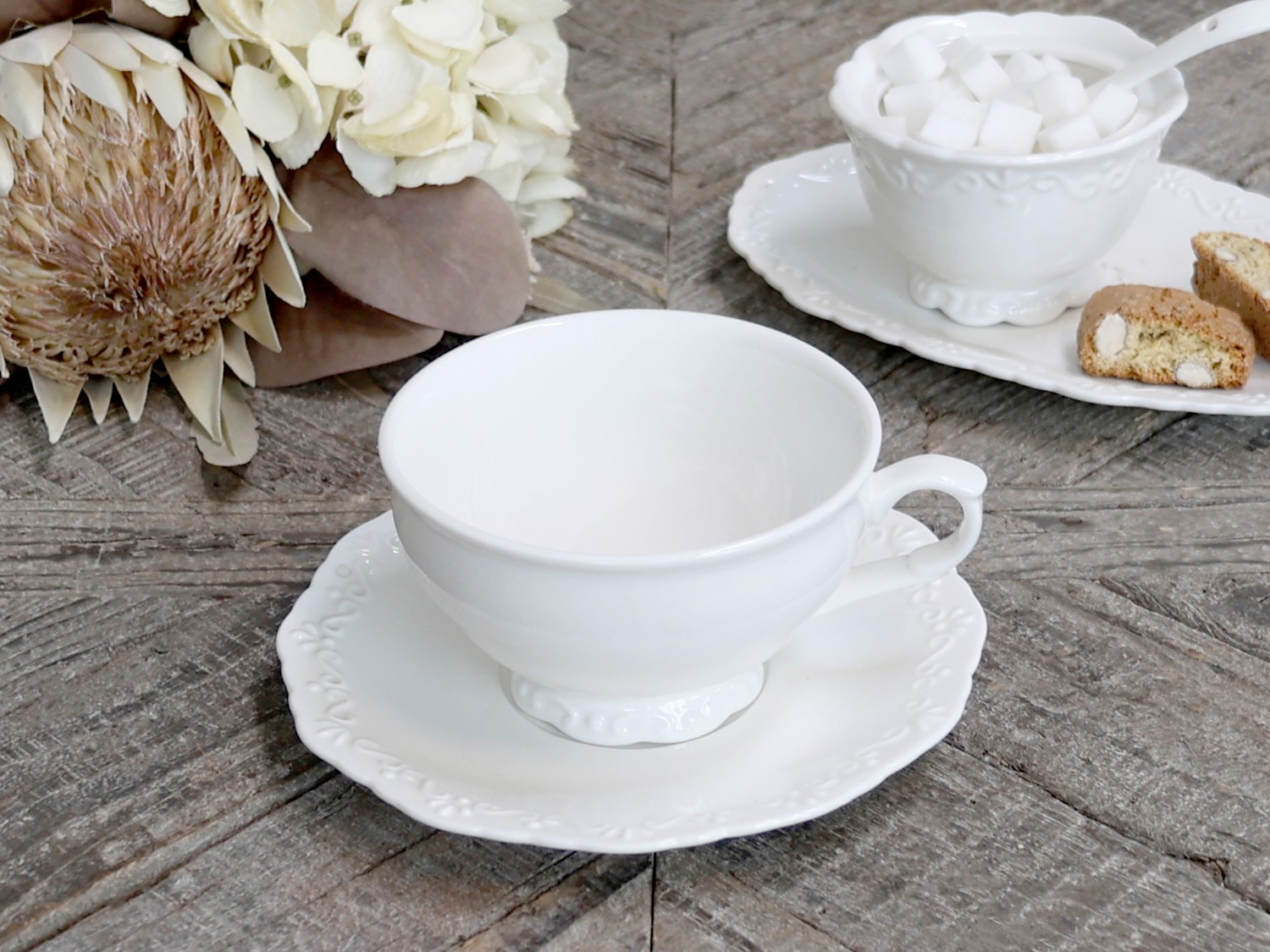 Porcelánová šálka s podšálkou a s jemným dekorom Provence z dielne dánskej značky Chic Antique. Jemná a elegantná porcelánová šálka je krásnym doplnkom do Vášho kuchynského servisu. Šálka je vhodná pre každého labužníka káv, čajíkov a podobne.