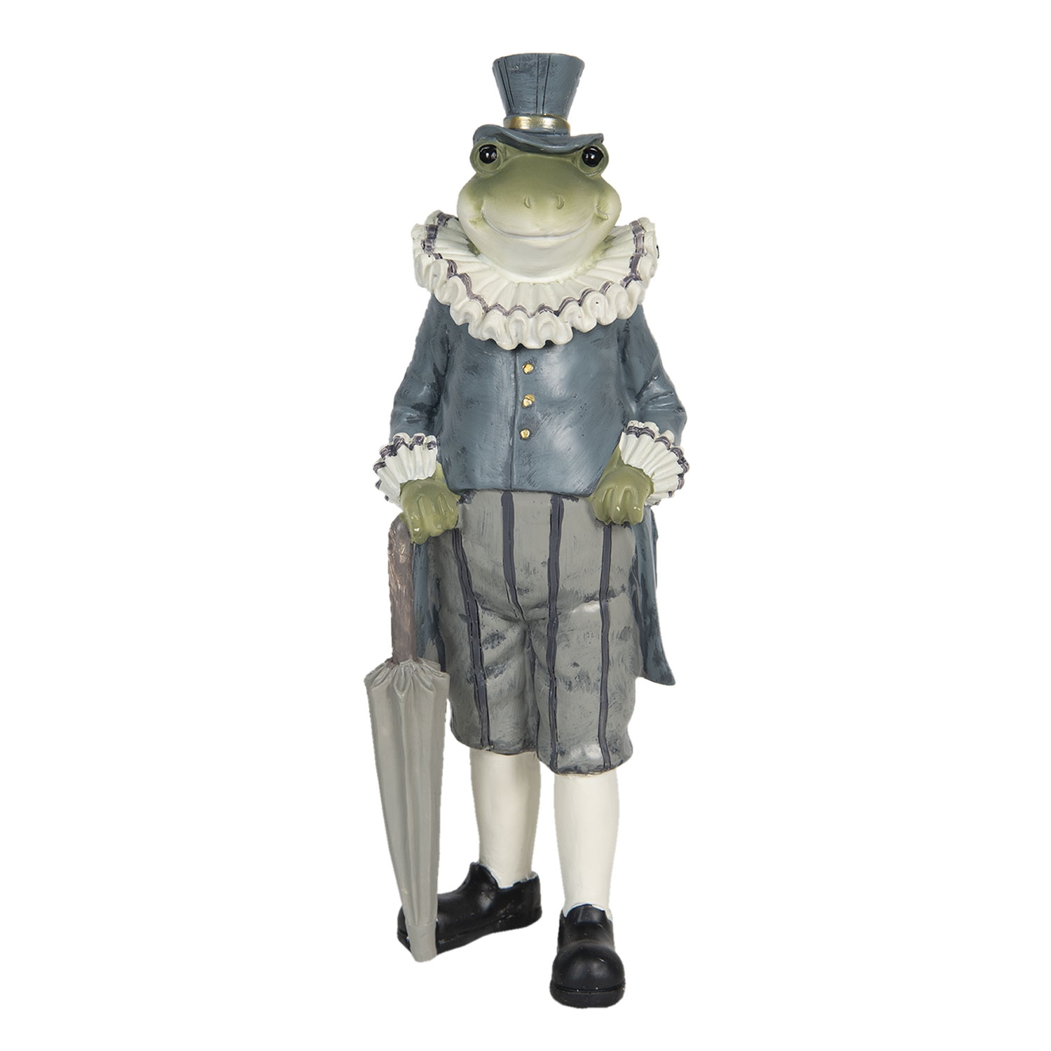 Elegantný romantický žabiak z polyresinu z dielne holandskej značky Clayre-Eef z kolekcie pre rok 2021. Žaba má oblečené sivé nohavice pod kolená, modrý frak s nariaseným bielym golierom, modrý klobúk a čierne topánky. V ruke drží dáždnik. Výška tohto žabiaka je 27 cm.