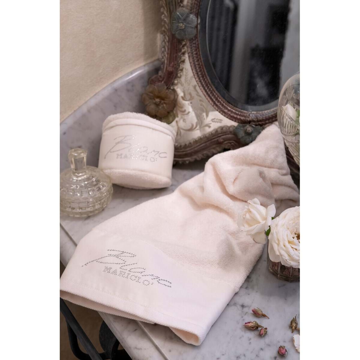 Set dvoch kusov uterákov v bielom farebnom prevedení so striebornými kamienkami od exkluzívnej talianskej značky Blanc Maricló. Uterák je vyrobený v schaby chic a romantickom štýle, ktorý si zamiluje nejeden milovník vintage prvkov. Nádherný doplnok do Vašej kúpeľne, vynímať sa bude všade. Uteráky obsahujú 100 % bavlny.